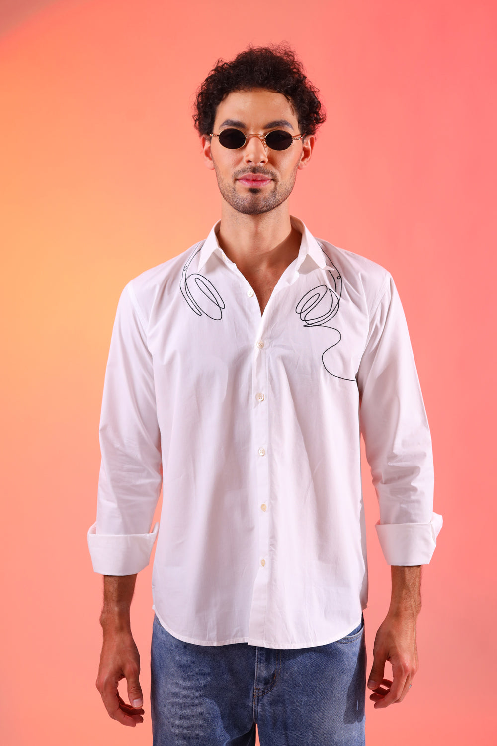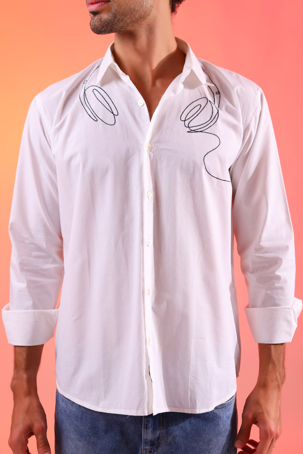The acoustic shirt is perfectly styled tucked into your favourite old blue jeans or worn with cut offs to create an elevated take on a classic day wear style. The shirt is hand embroidered comes in 100% white cotton poplin