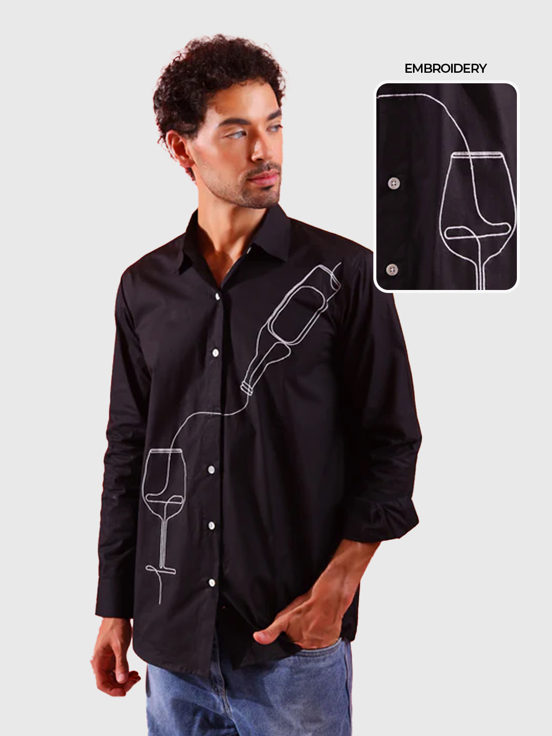 The "Black wine Shirt" is a captivating and artfully crafted piece that seamlessly fuses sophistication with a touch of whimsy. This pure cotton shirt showcases exquisite embroidery, featuring a delightful wine glass motif on the front that captures the essence of indulgence and elegance.