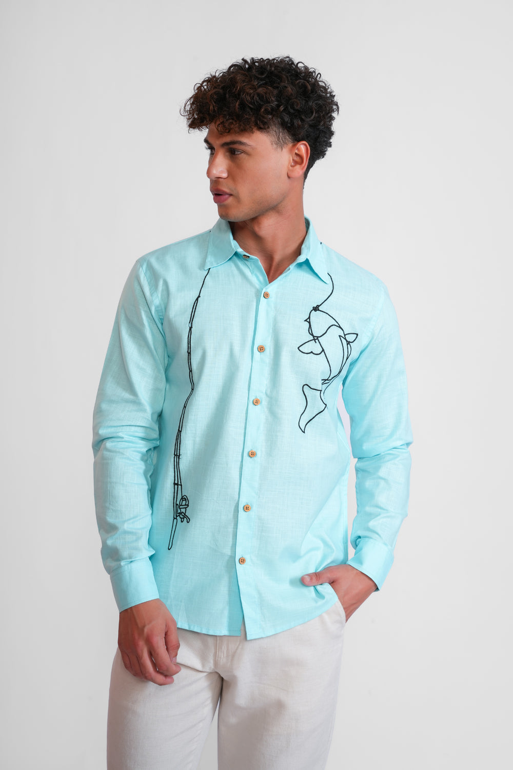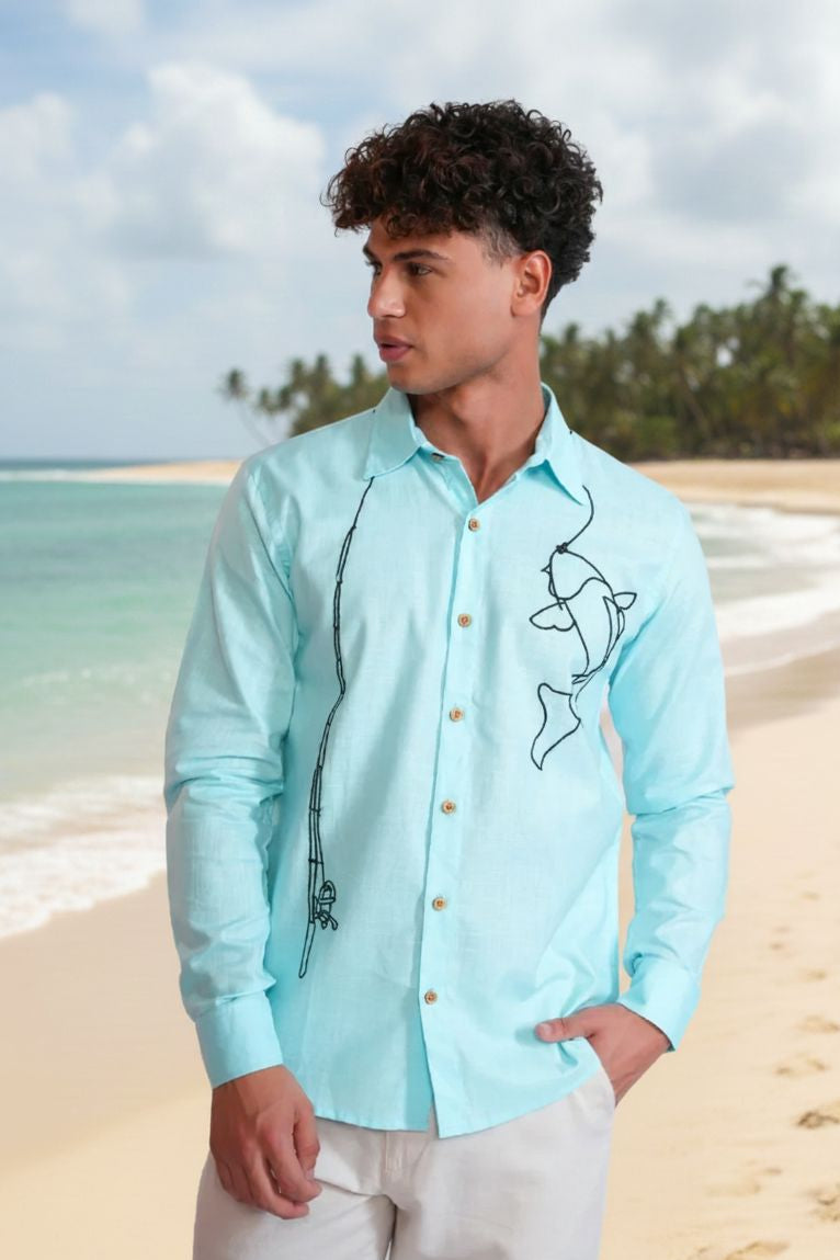Crafted from 100% pure cotton, this one-of-a-kind shirt showcases intricate embroidery throughout. The front panel features a beautifully detailed fishing rod with a caught fish. The design is completely embroidered, making this piece truly unique and perfect for those who appreciate artisanal craftsmanship.