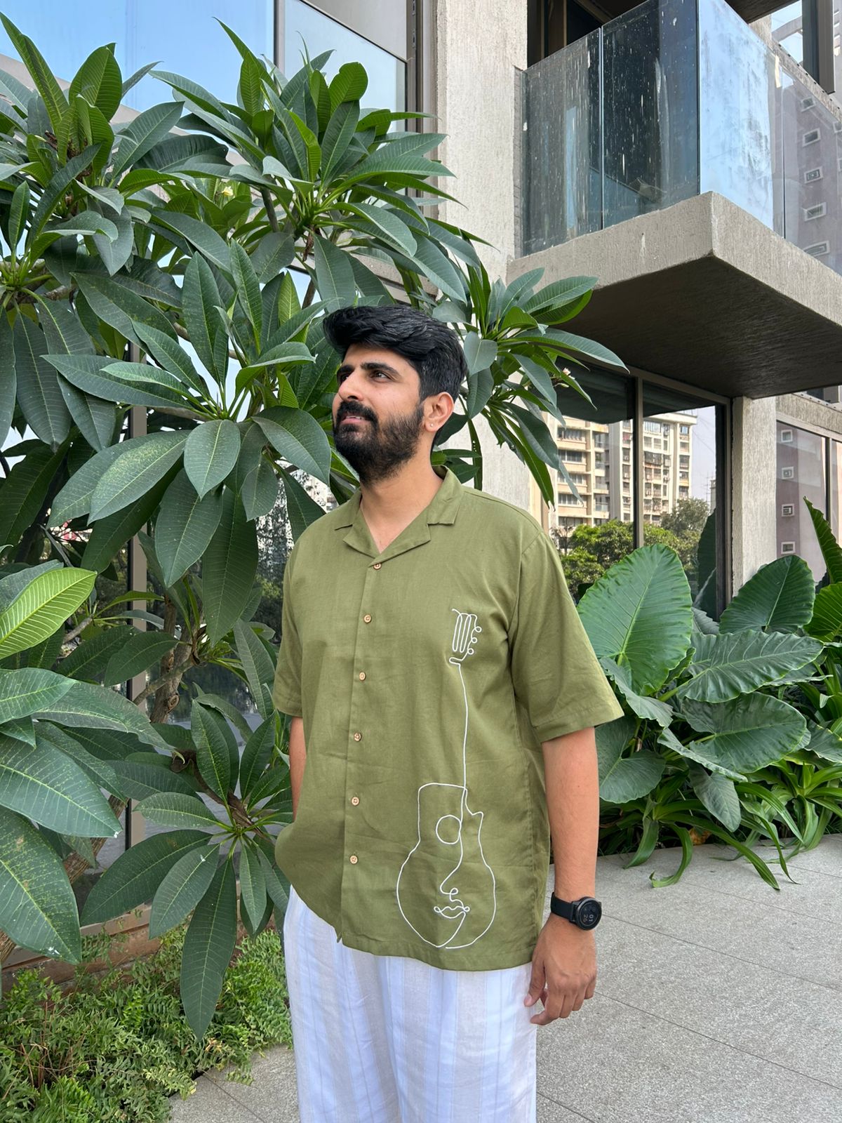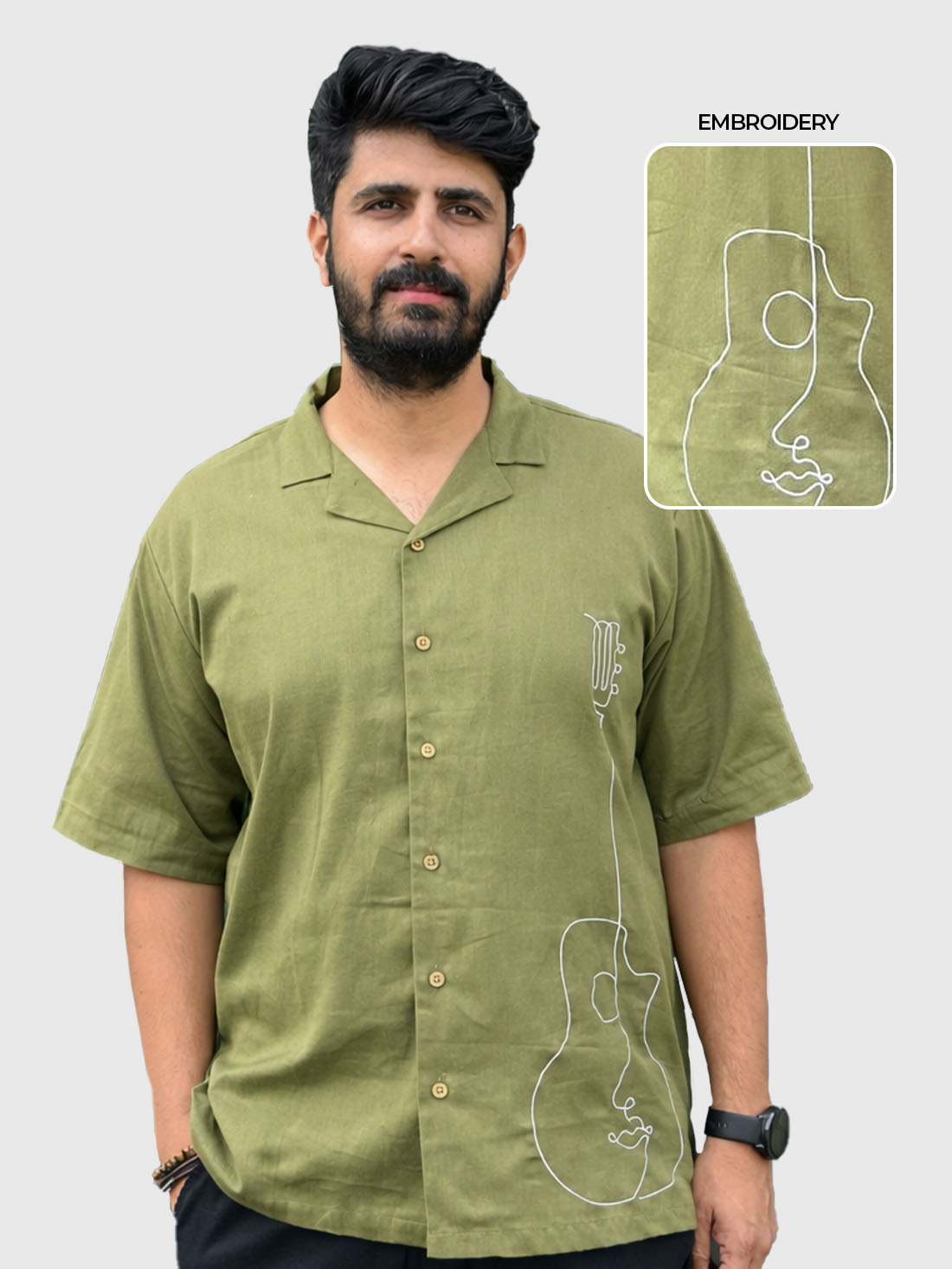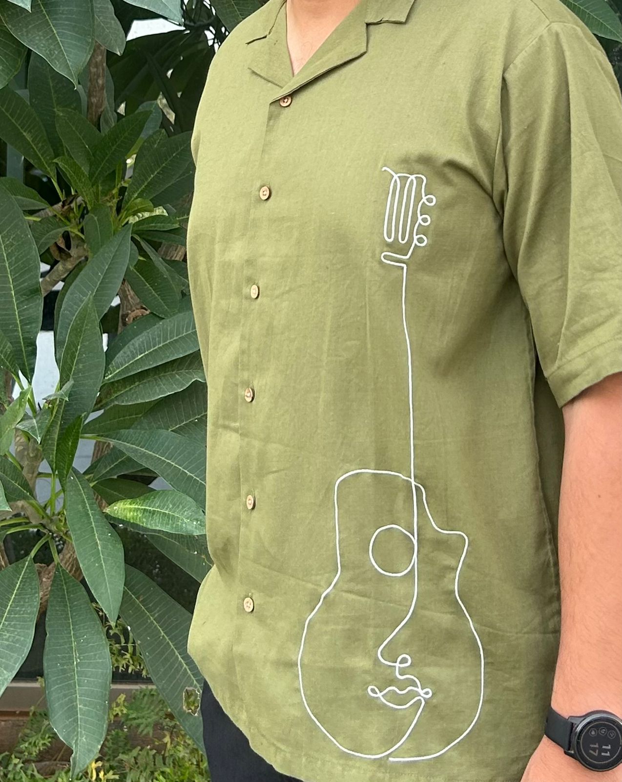 Crafted in a soft cotton–linen blend, this green shirt stands out with its uniquely embroidered guitar motif that subtly transforms into an abstract line-art face, giving the piece a creative and contemporary edge. The breathable fabric, relaxed silhouette, and lightweight feel make it perfect for everyday wear, vacations, or those who love elevated artsy details—an effortless statement shirt that blends comfort with artistic expression.