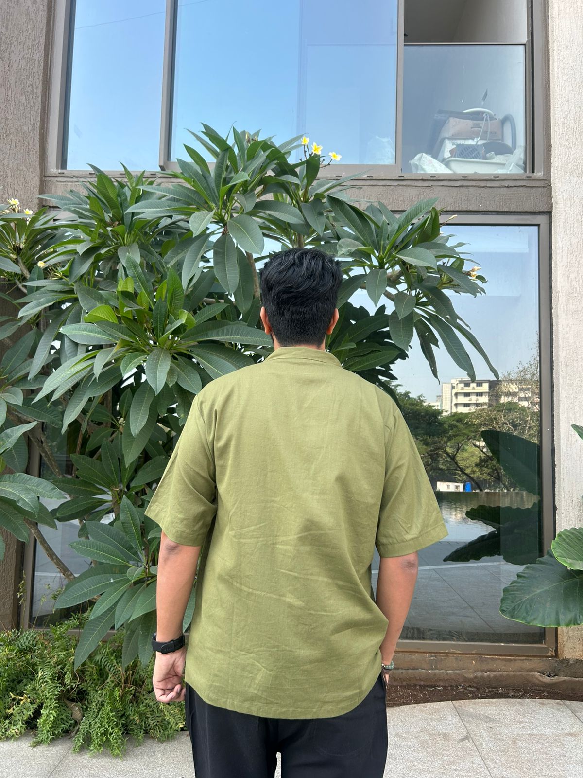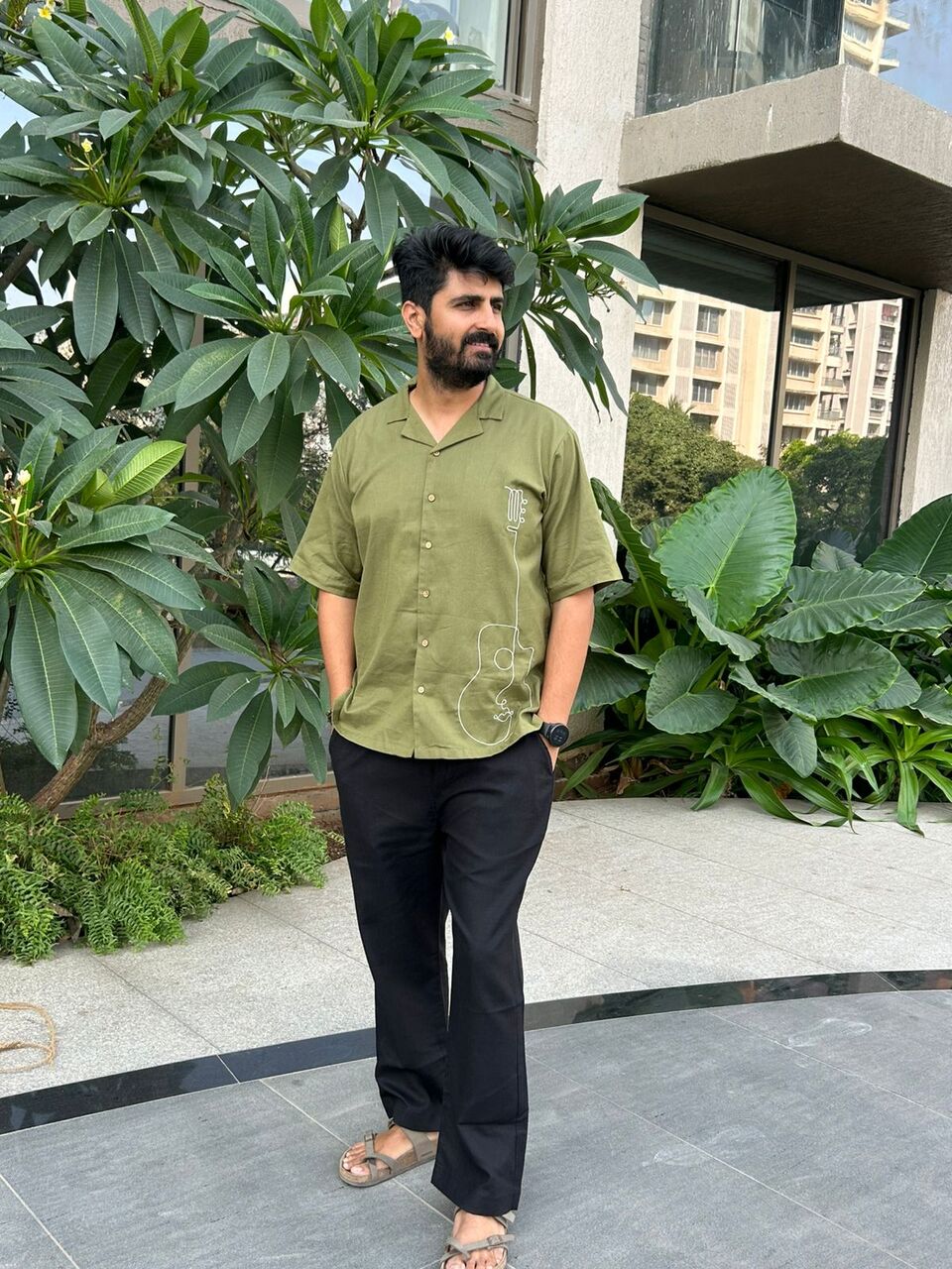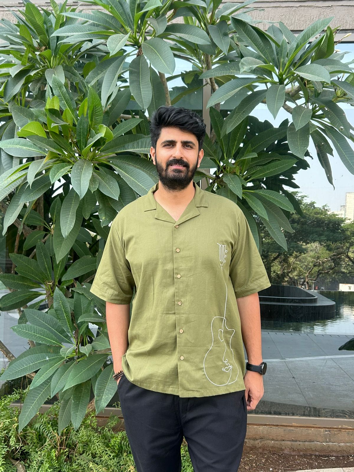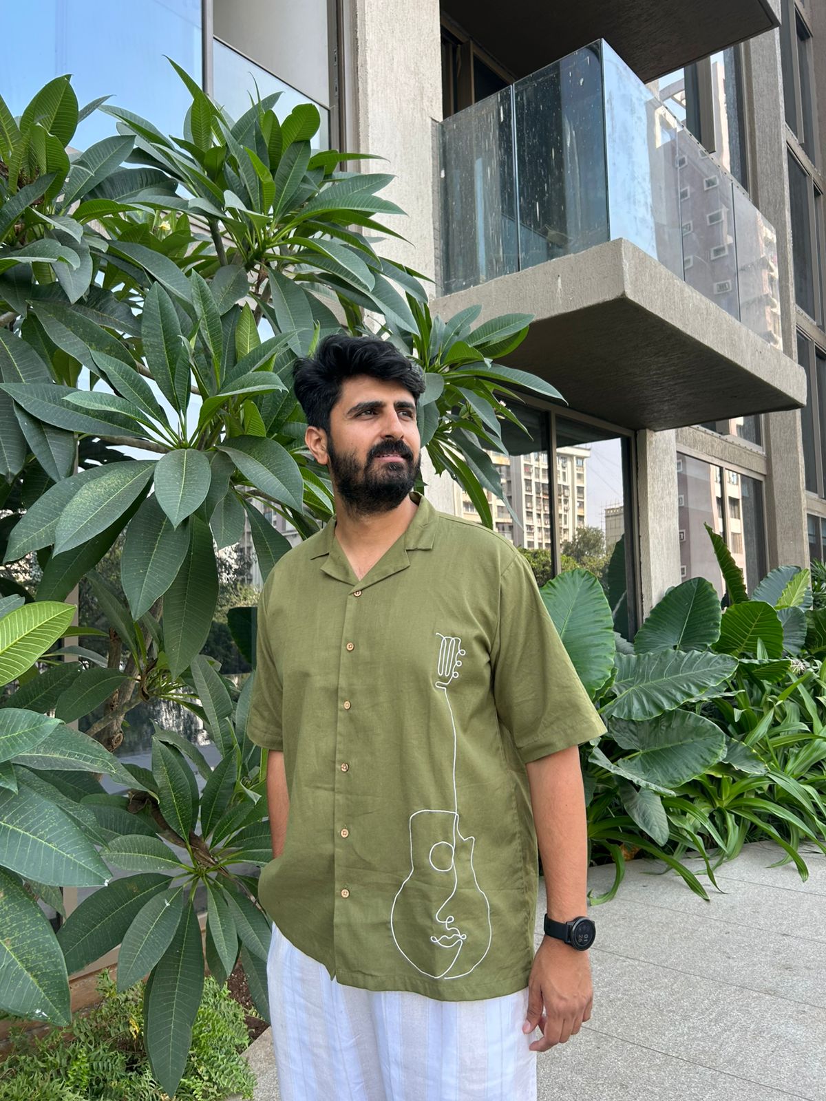 Crafted in a soft cotton–linen blend, this green shirt stands out with its uniquely embroidered guitar motif that subtly transforms into an abstract line-art face, giving the piece a creative and contemporary edge. The breathable fabric, relaxed silhouette, and lightweight feel make it perfect for everyday wear, vacations, or those who love elevated artsy details—an effortless statement shirt that blends comfort with artistic expression.