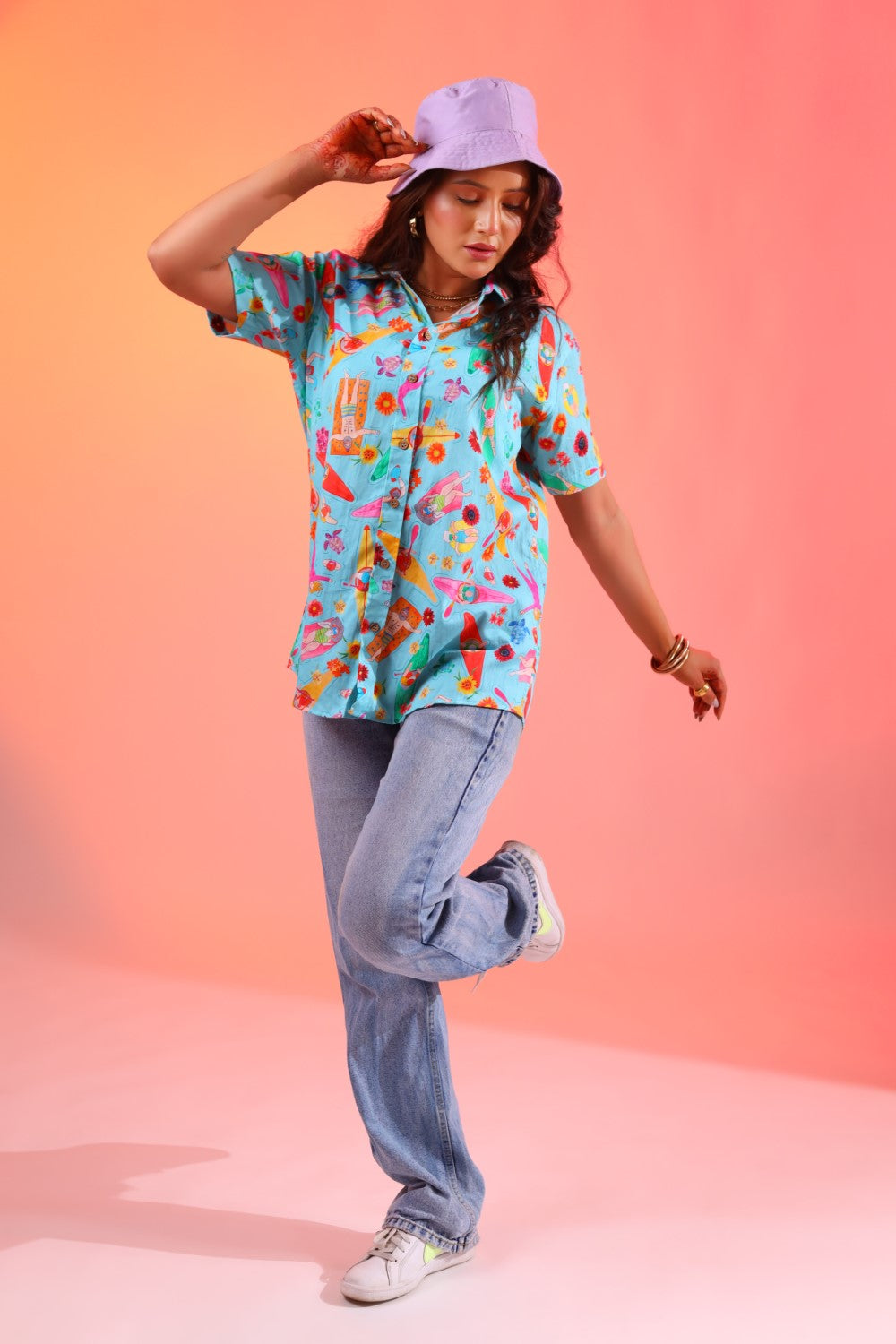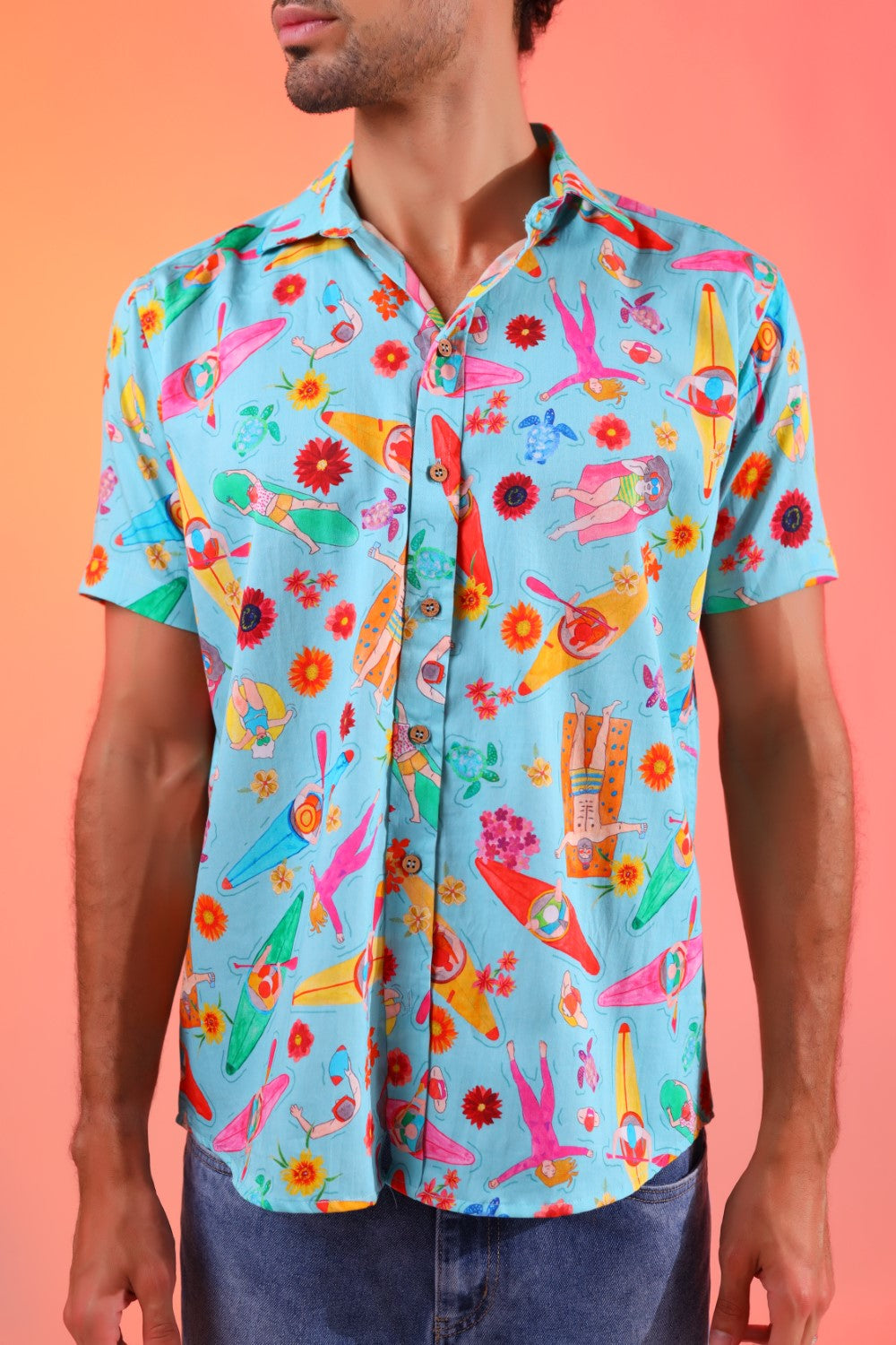 The Kayaking Shirt is our exclusive print, featuring vibrant summer elements where people are having fun in the water, including kayaking, swimming, and chilling. Made from pure cotton, this shirt combines comfort with style. Designed by us and digitally printed, it promises to be an exclusive addition to your wardrobe.