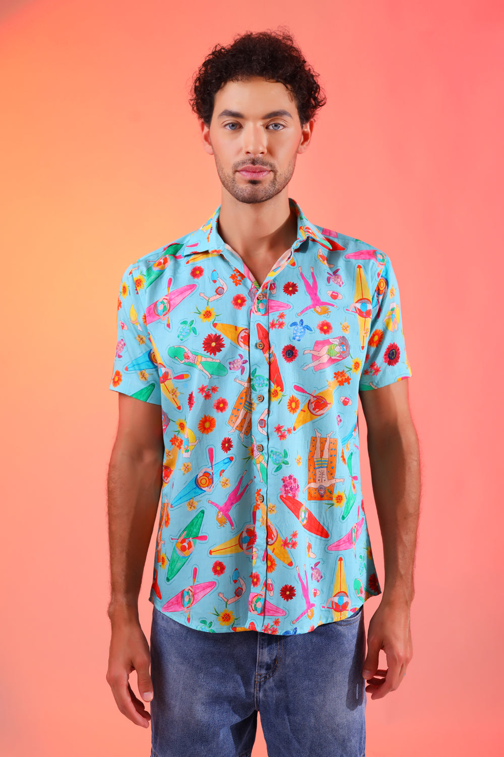 The Kayaking Shirt is our exclusive print, featuring vibrant summer elements where people are having fun in the water, including kayaking, swimming, and chilling. Made from pure cotton, this shirt combines comfort with style. Designed by us and digitally printed, it promises to be an exclusive addition to your wardrobe.