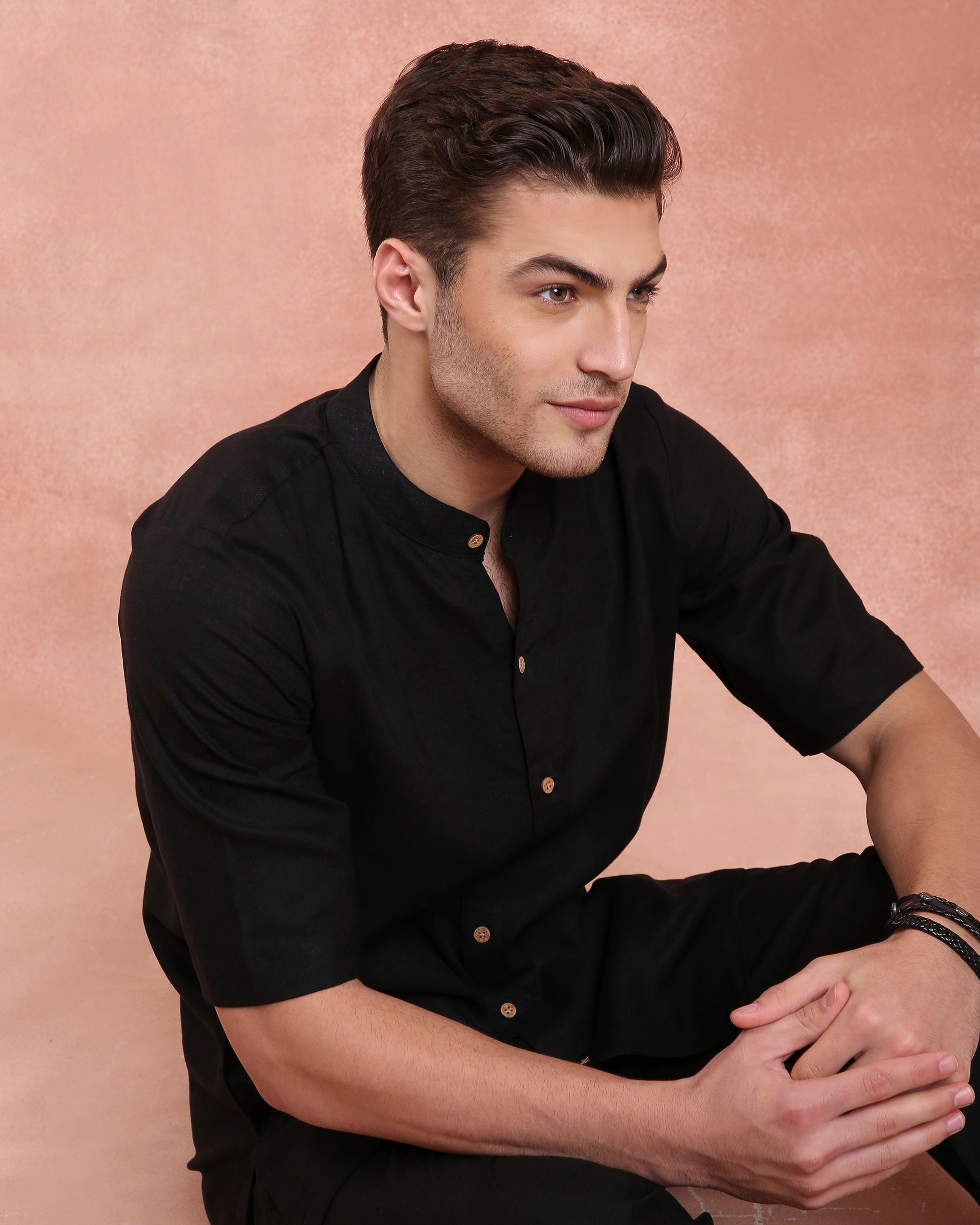 A clean and airy Co-ord set in soft black, This set blends relaxed kimono styling with an everyday-ready silhouette. The shirt features an open front with side pockets on the shirt, while the matching bottoms keep the flow going. Designed in a cotton–lyocell–linen blend for breathable all-day wear.