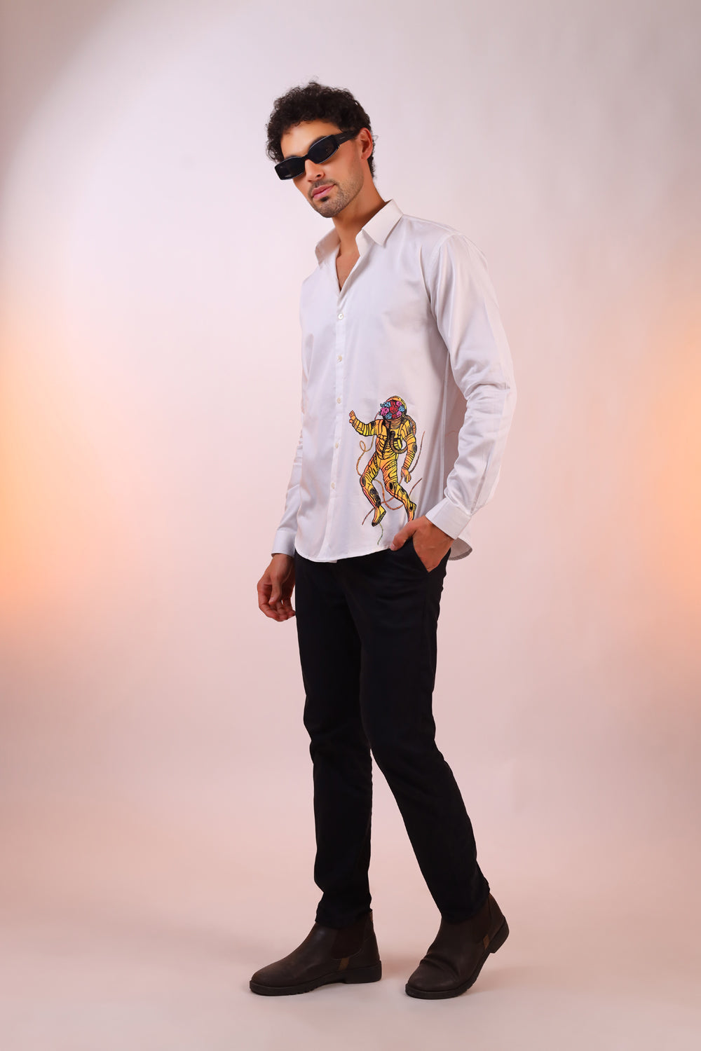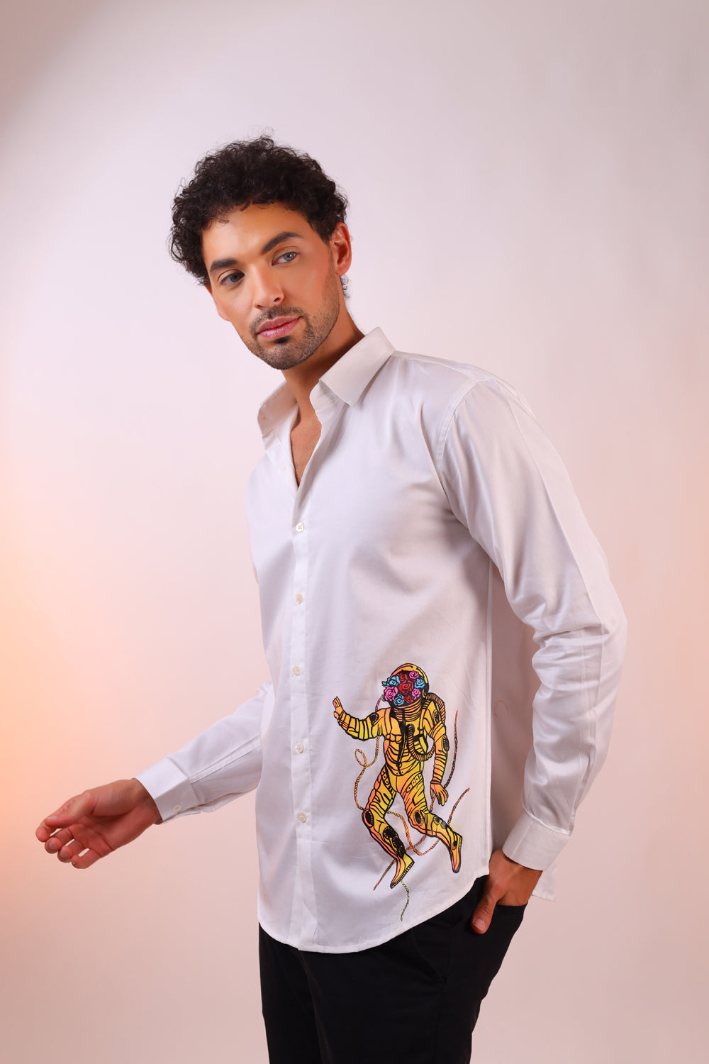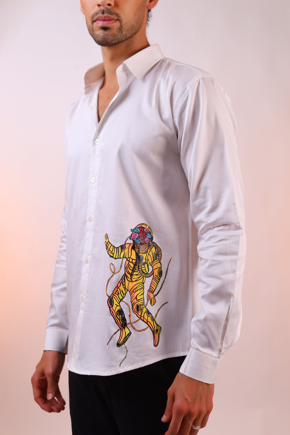 Step out in style with the Orbit artist Hand-Painted Shirt! The shirt is meticulously hand-painted to ensure each shirt is one-of-a-kind. Perfect for parties and casual outings, this shirt features a vibrant, hand-painted design of a astronaut that adds a unique and artistic touch to your wardrobe. Crafted from high-quality, breathable fabric, it ensures comfort while making a bold fashion statement. Get ready for guaranteed compliments as you showcase your fun and funky side with this standout piece!