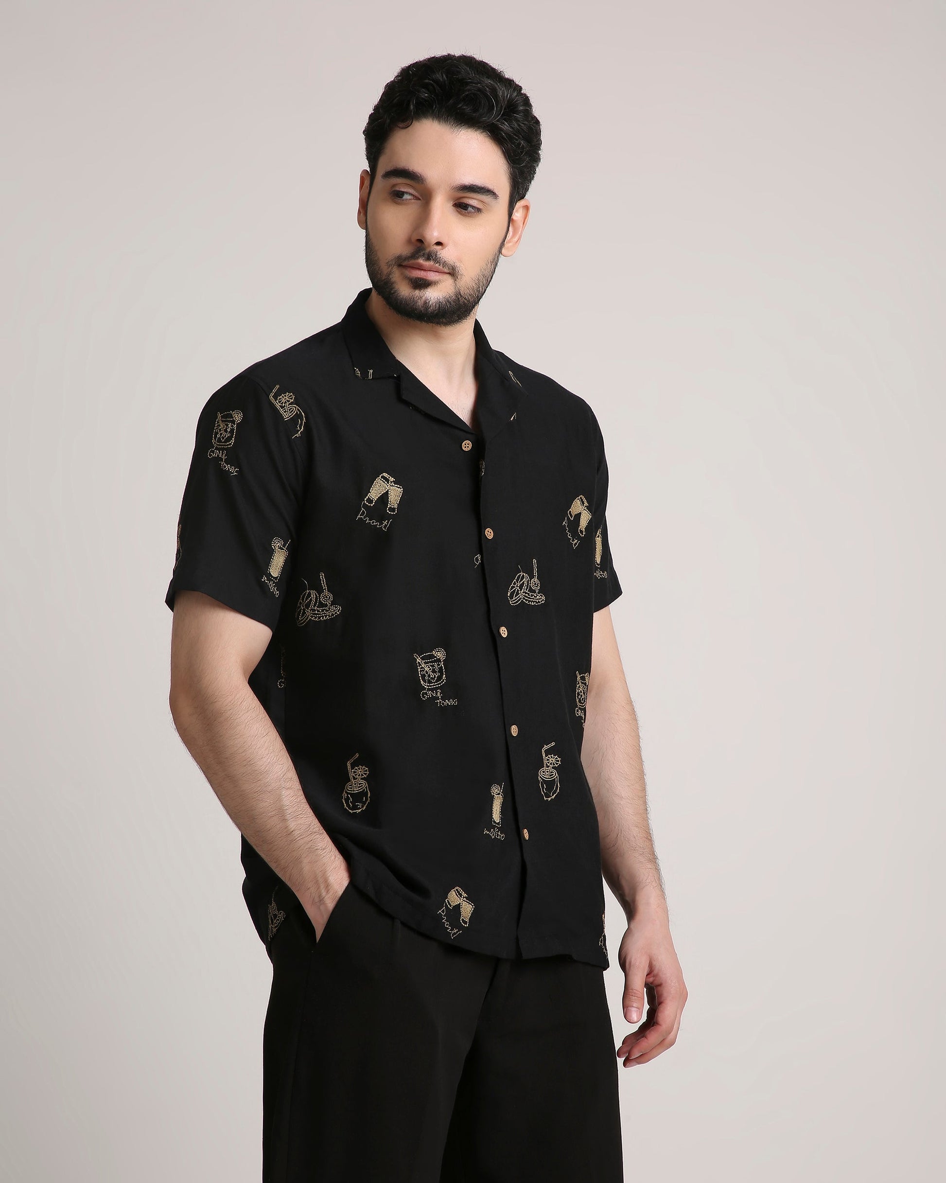 Turn heads at every party with our Saturday Night Shirt, featuring exquisite embroidery of iconic cocktails—Mojito, Gin & Tonic, and more. Made from pure cotton, it offers unmatched comfort with a touch of playful sophistication. Perfect for your next night out, this statement piece is a must-have for cocktail lovers and trendsetters alike.