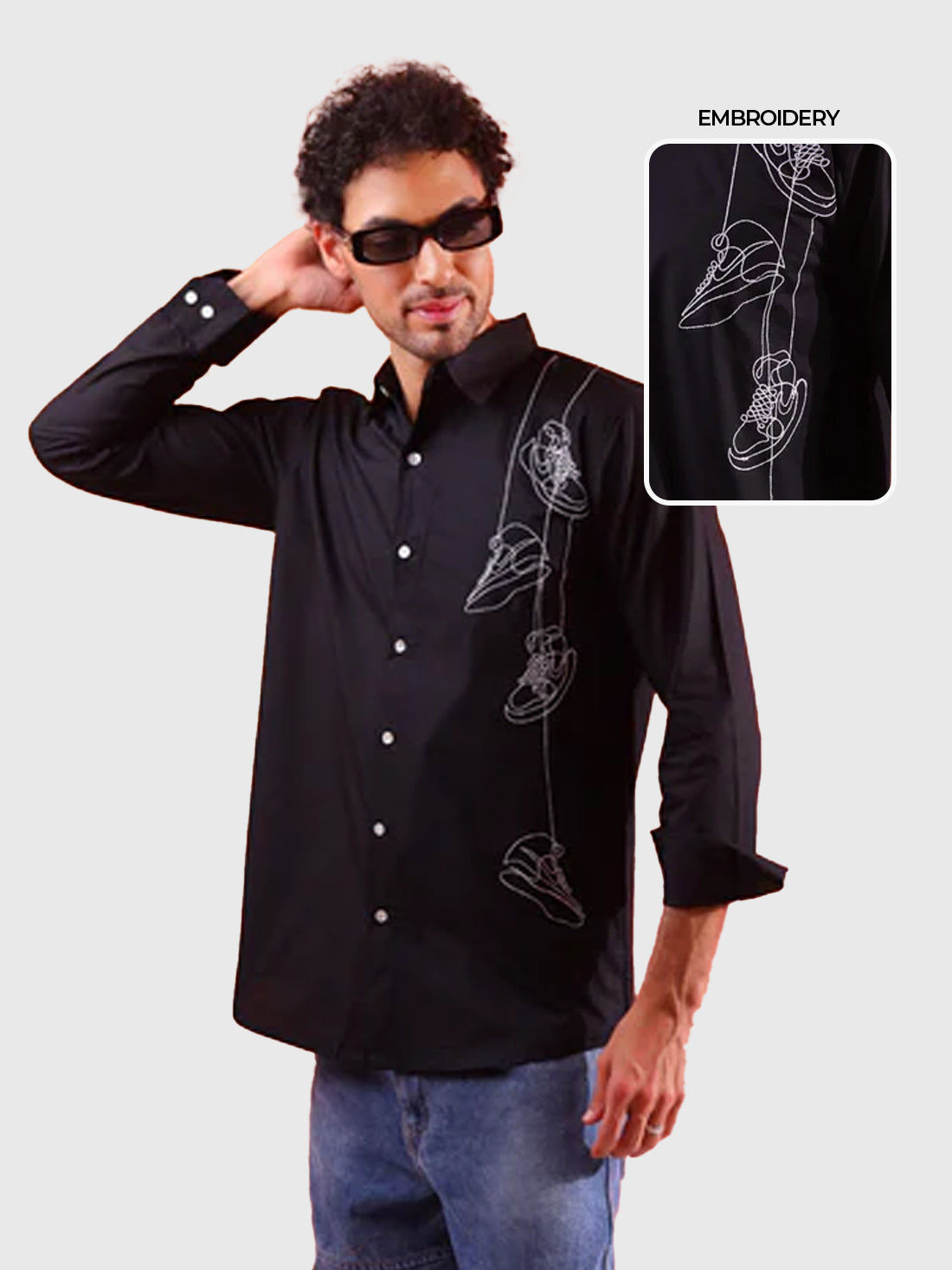 A classic shirt updated with a quirky line artwork forms a great piece for men’s wear destined to become a centrepiece of your casual evening wardrobe. The shirt is hand embroidered comes 100% Black cotton poplin