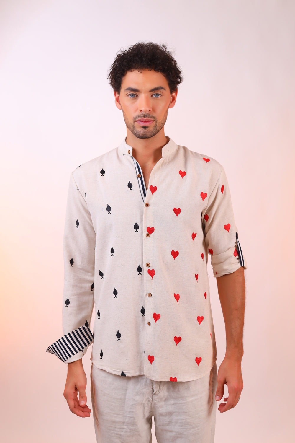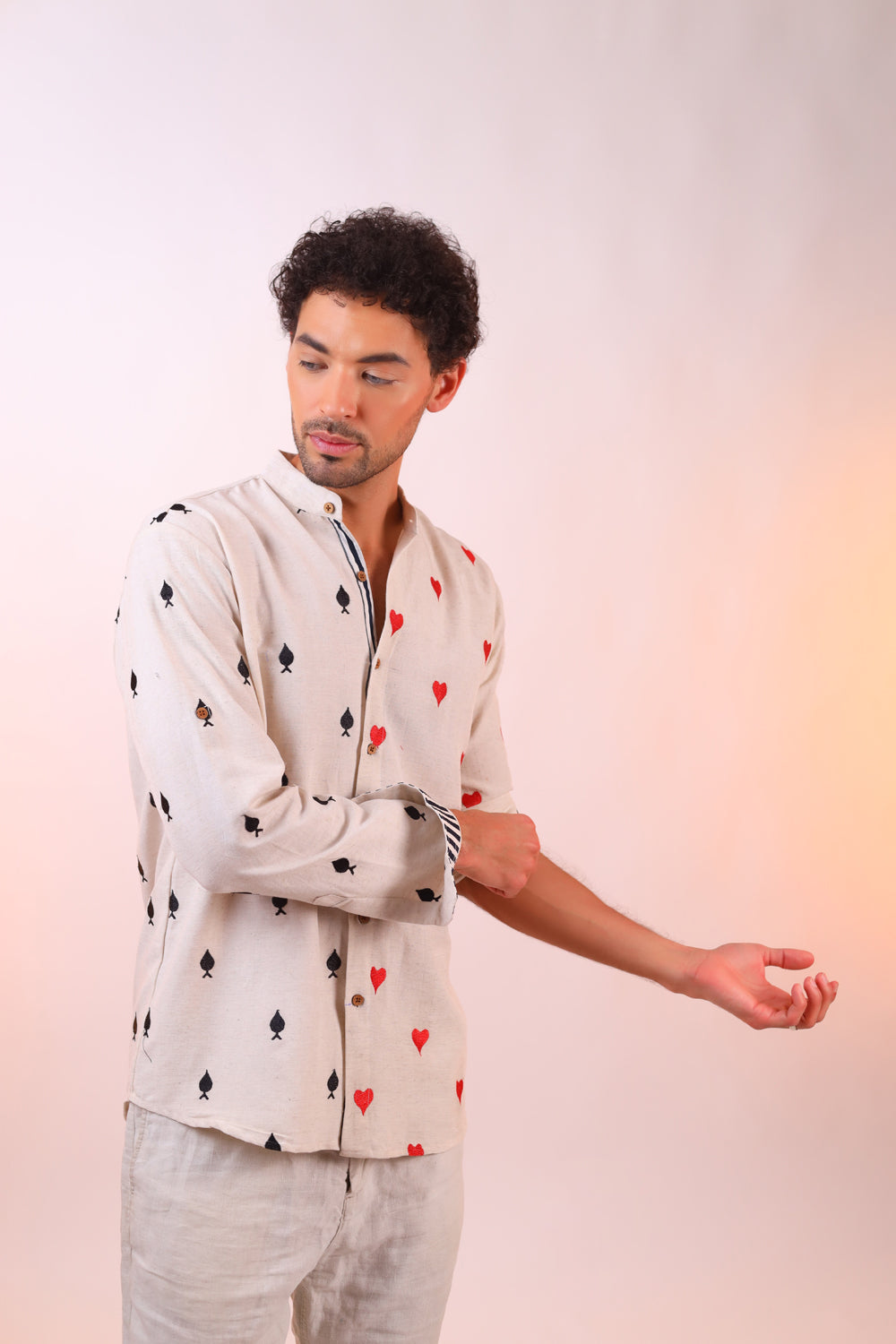 "This Spade of Hearts embroidered shirt is a celebration in itself, meticulously crafted from pure cotton and tailor-made for the grandeur of Diwali parties and other festive celebrations. Its exquisite design features an intricate Spade & heart pattern embroidery, lending an air of sophistication and style to your attire. The pure cotton fabric ensures comfort, allowing you to revel in the festivities with ease. Whether you're attending a Diwali gathering or any other special occasion, this shirt is your perfect choice to make a lasting impression and embrace the joyous spirit of celebratio."