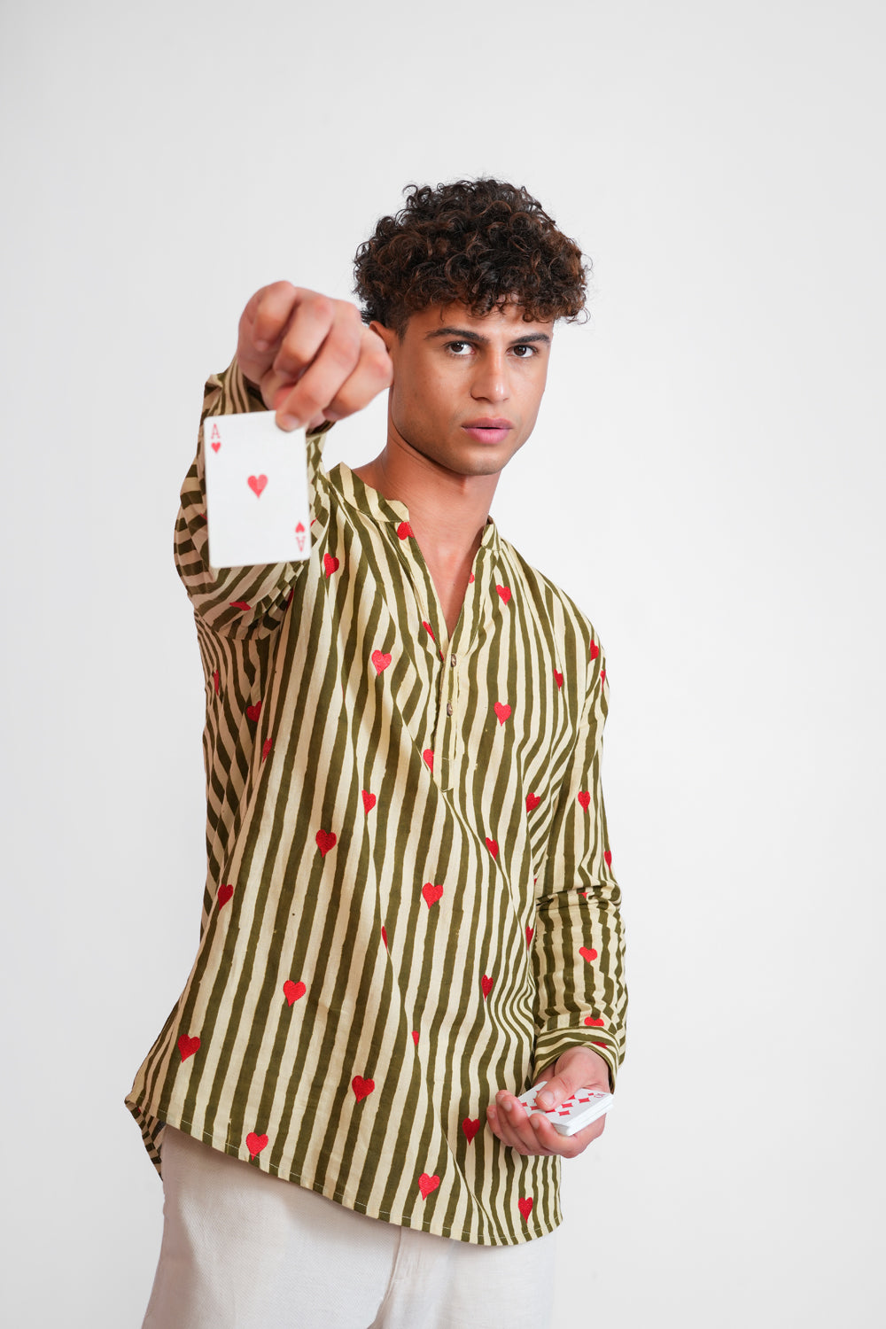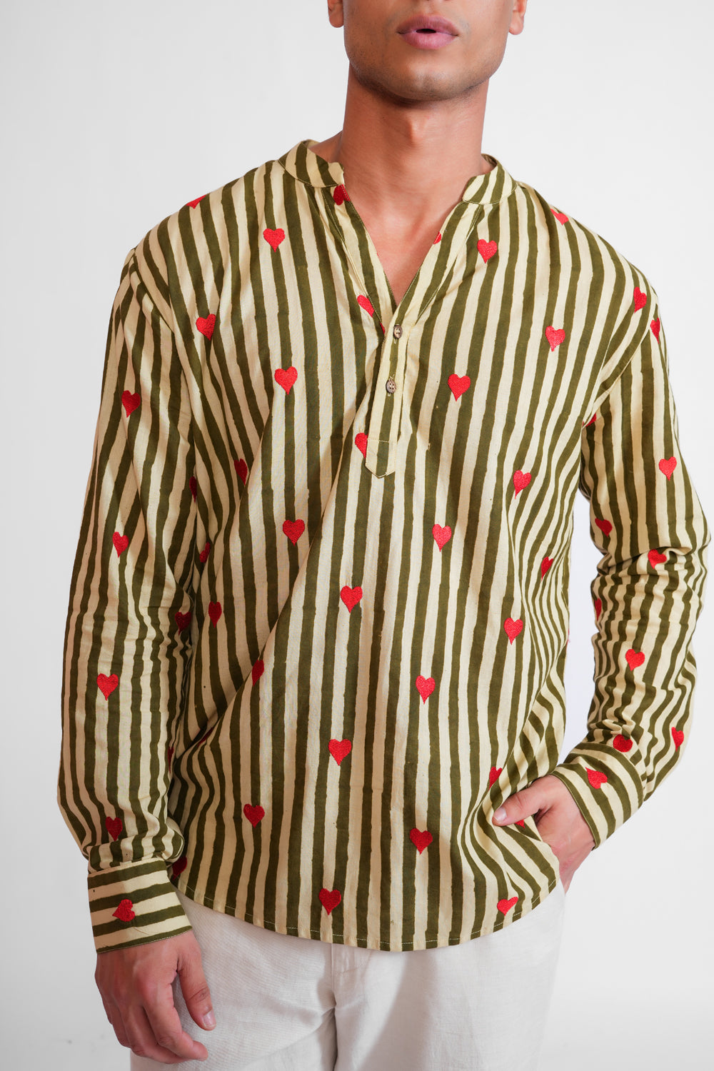 This kurta-style shirt features bold green and off-white stripes, beautifully block-printed and accented with embroidered hearts. Its unique blend of traditional and modern elements makes it the perfect choice for Diwali parties, card game nights, or casual outings. Stylish yet versatile, this piece ensures you stand out effortlessly at any occasion.