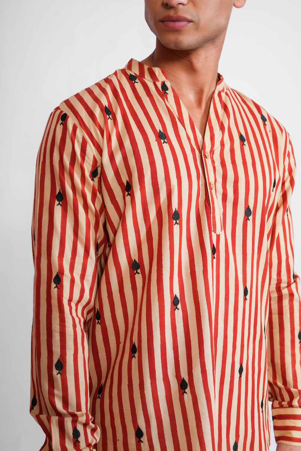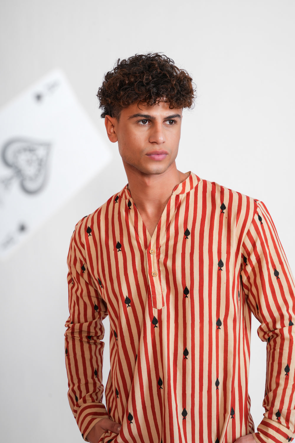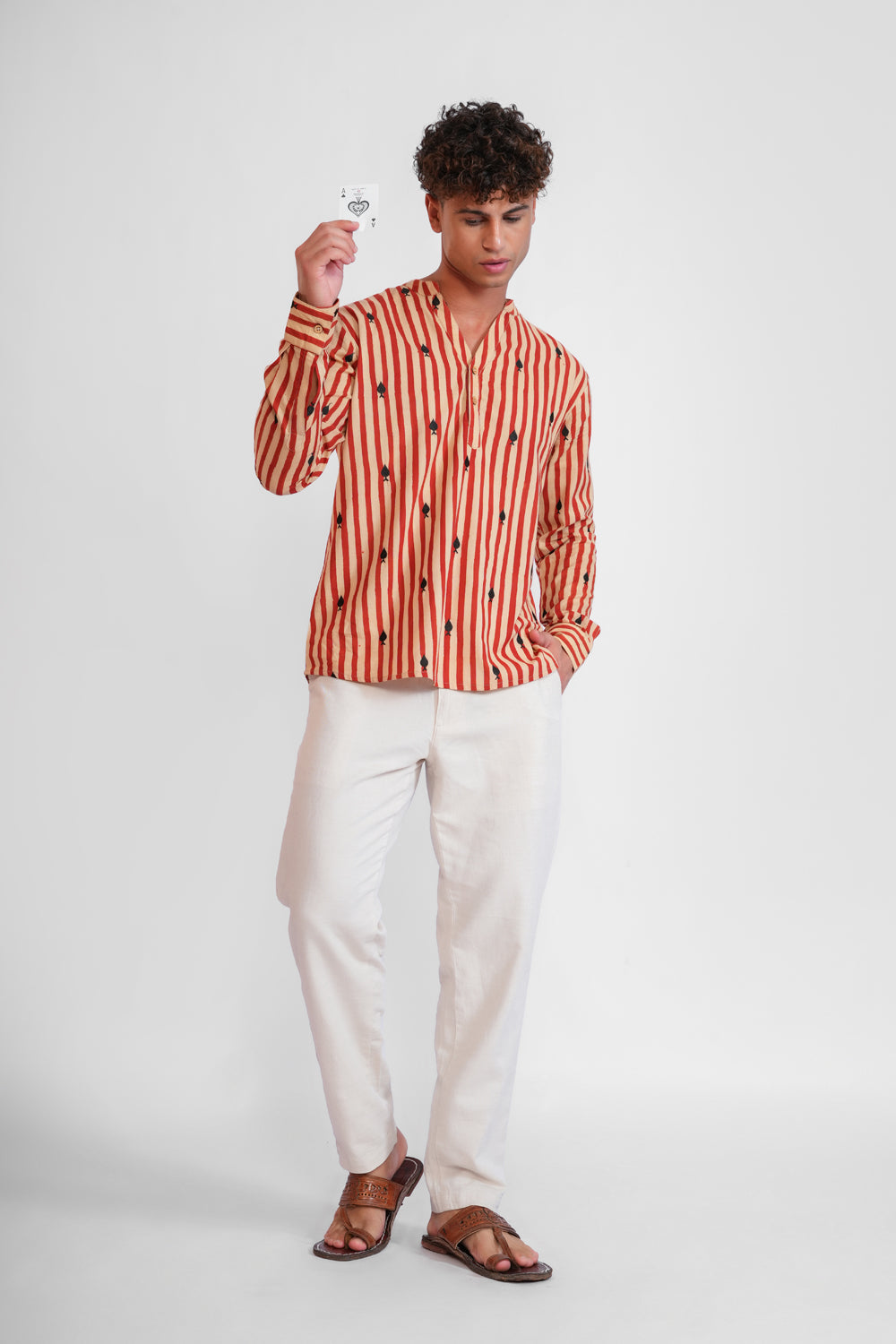 This kurta-style shirt features bold red and off-white stripes, beautifully block-printed and accented with embroidered spades. Its unique blend of traditional and modern elements makes it the perfect choice for Diwali parties, card game nights, or casual outings. Stylish yet versatile, this piece ensures you stand out effortlessly at any occasion.