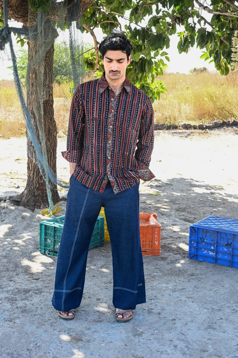A refined Ajrakh-inspired oversized shirt in earthy tones with vertical stripe motifs, hand-done Ajrakh motifs, and natural dyes. Featuring a relaxed, oversized silhouette and a clean button-down front with contrast detailing along the placket, it blends traditional craft with modern everyday style.