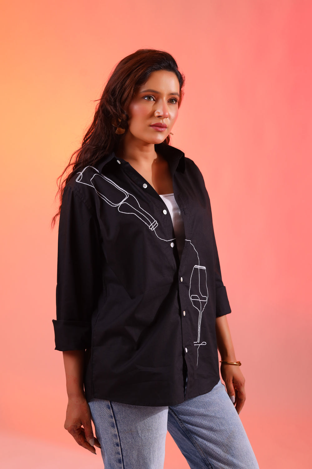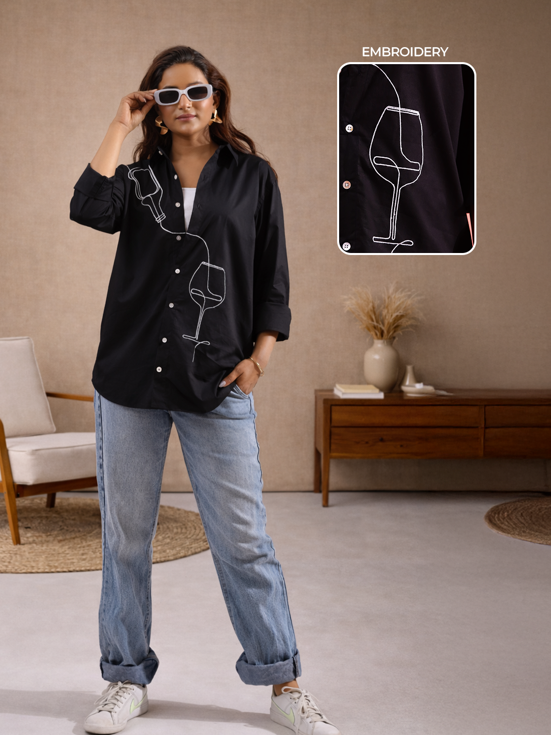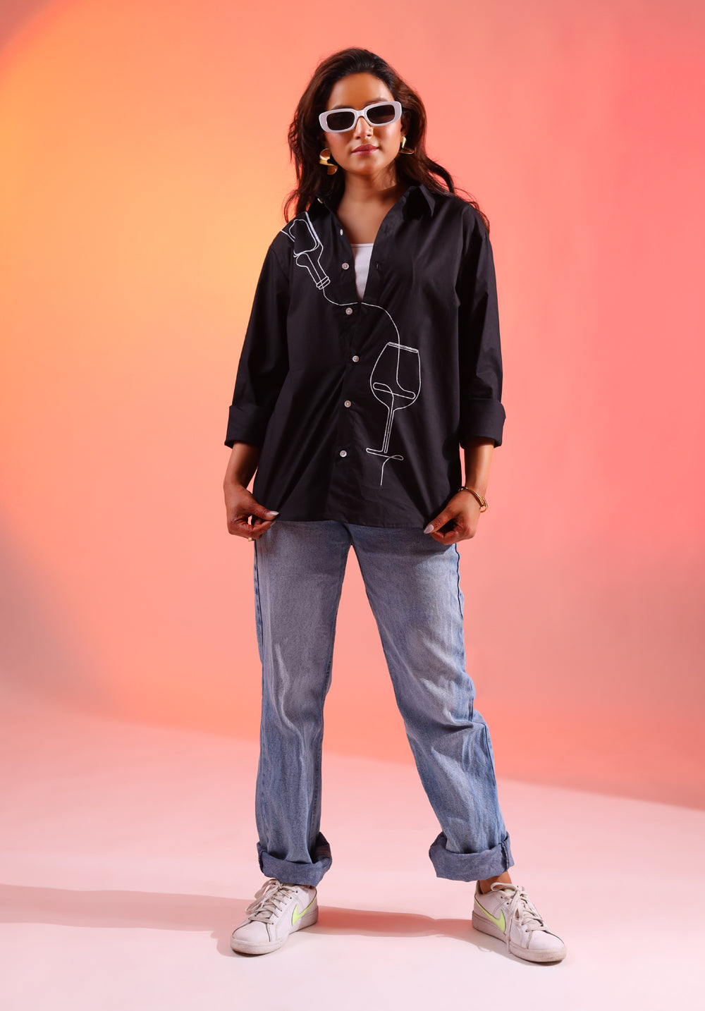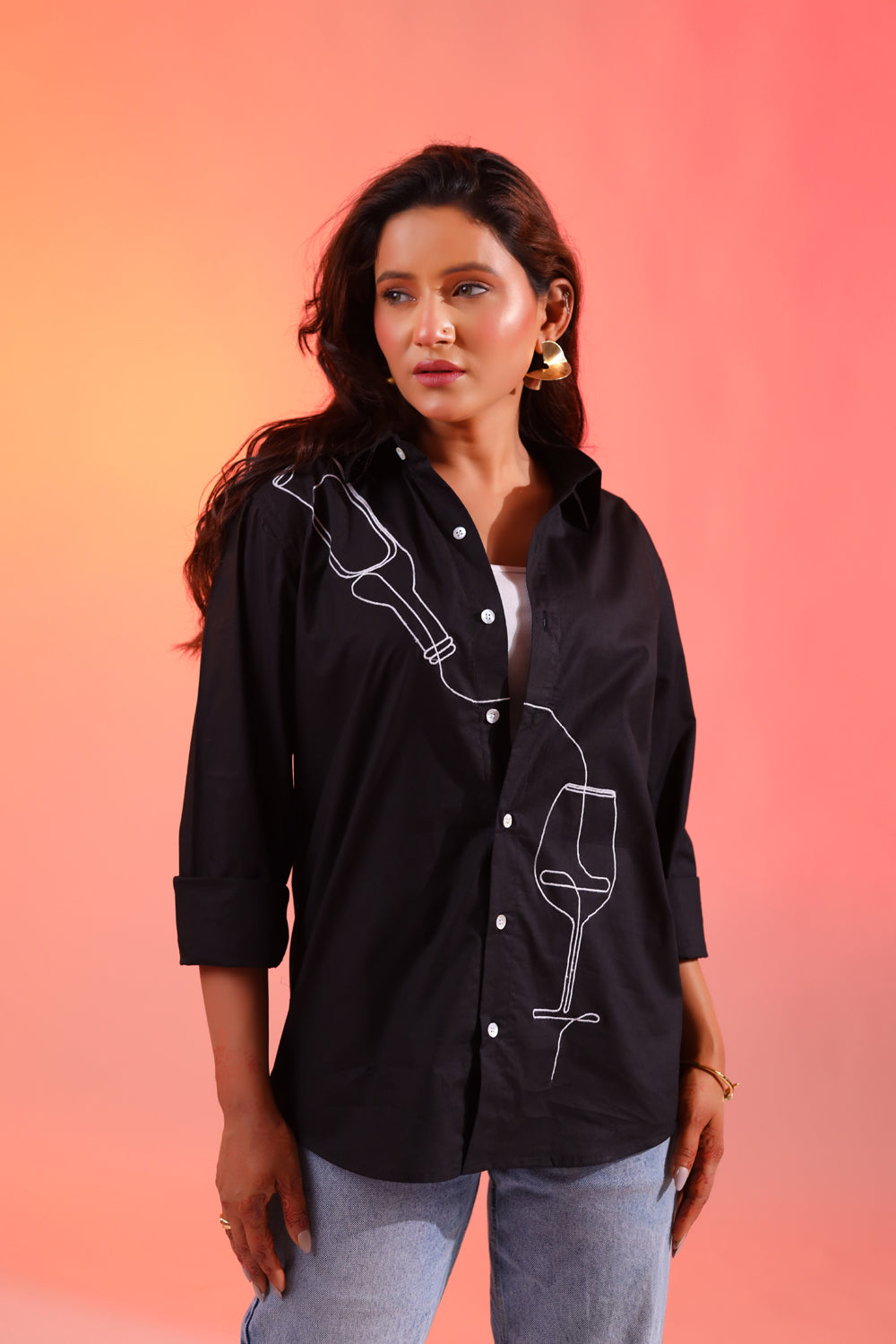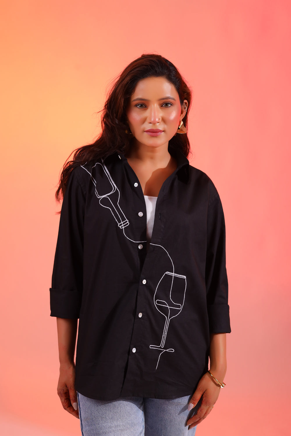 The "Black wine Shirt" is a captivating and artfully crafted piece that seamlessly fuses sophistication with a touch of whimsy. This pure cotton shirt showcases exquisite embroidery, featuring a delightful wine glass motif on the front that captures the essence of indulgence and elegance.