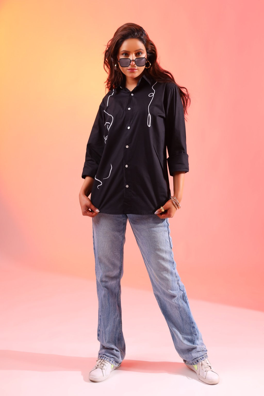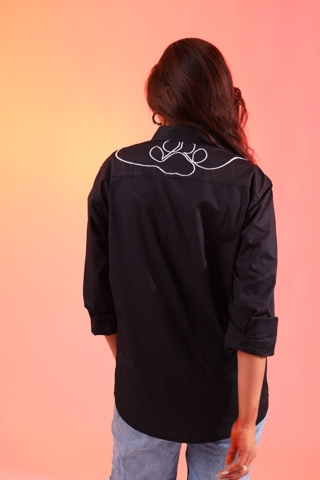 The "Bruno Shirt" is a distinctive and meticulously crafted garment that seamlessly combines sophistication with a playful touch of creativity. This pure cotton shirt boasts intricate hand embroidery, featuring an adorable dog motif on the front and charming paw prints on the back.