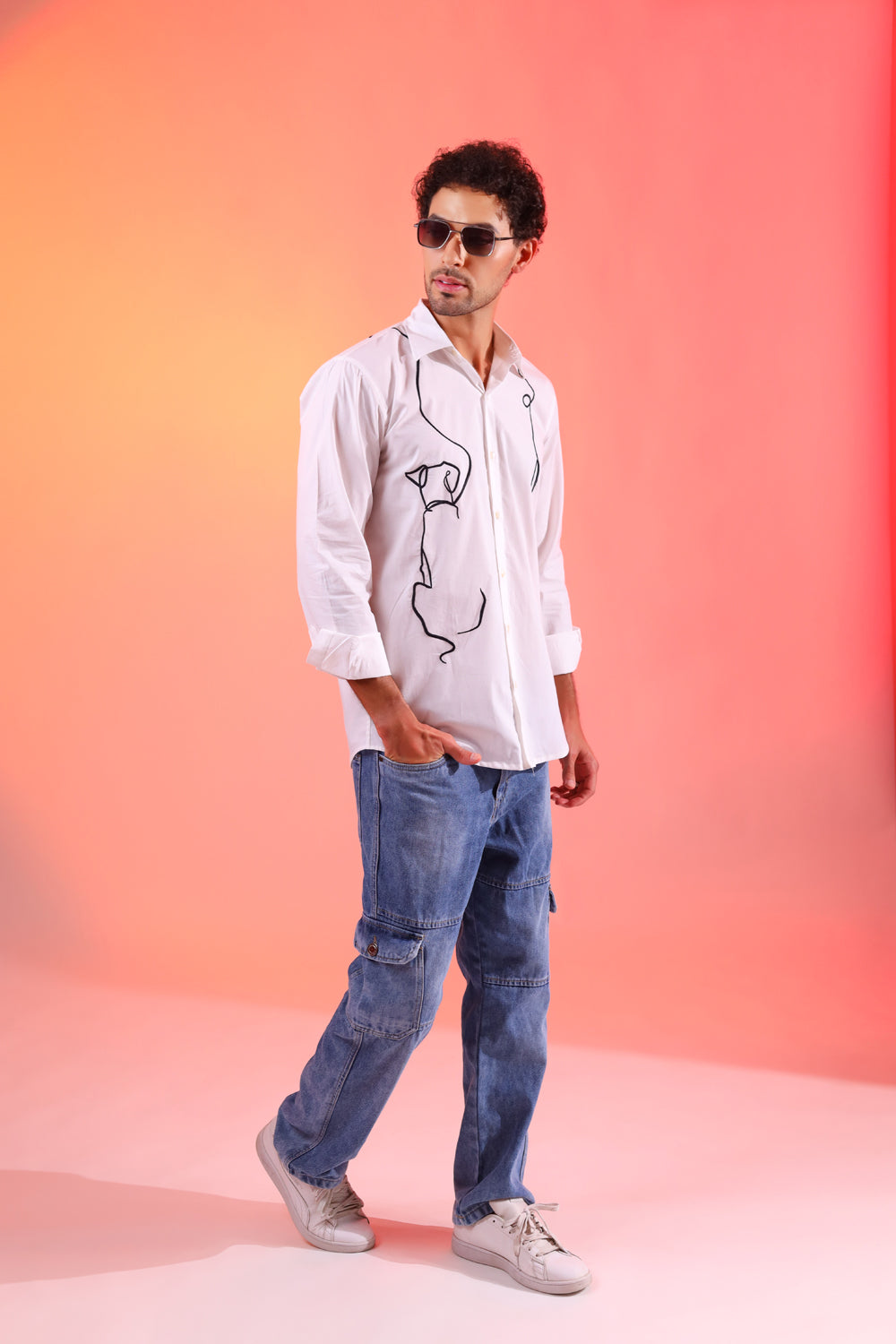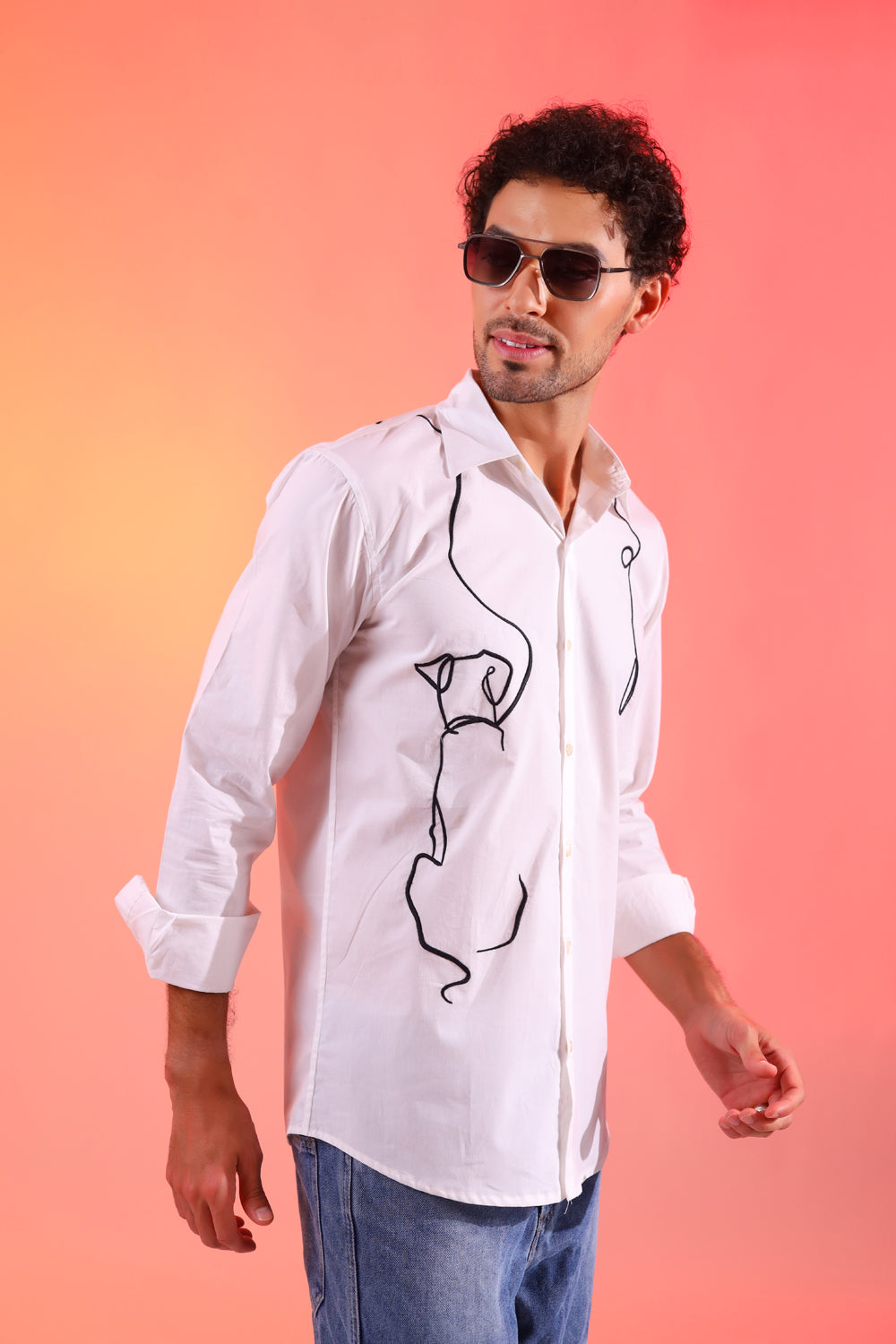 The "Bruno Shirt" is a distinctive and meticulously crafted garment that seamlessly combines sophistication with a playful touch of creativity. This pure cotton shirt boasts intricate hand embroidery, featuring an adorable dog motif on the front and charming paw prints on the back.