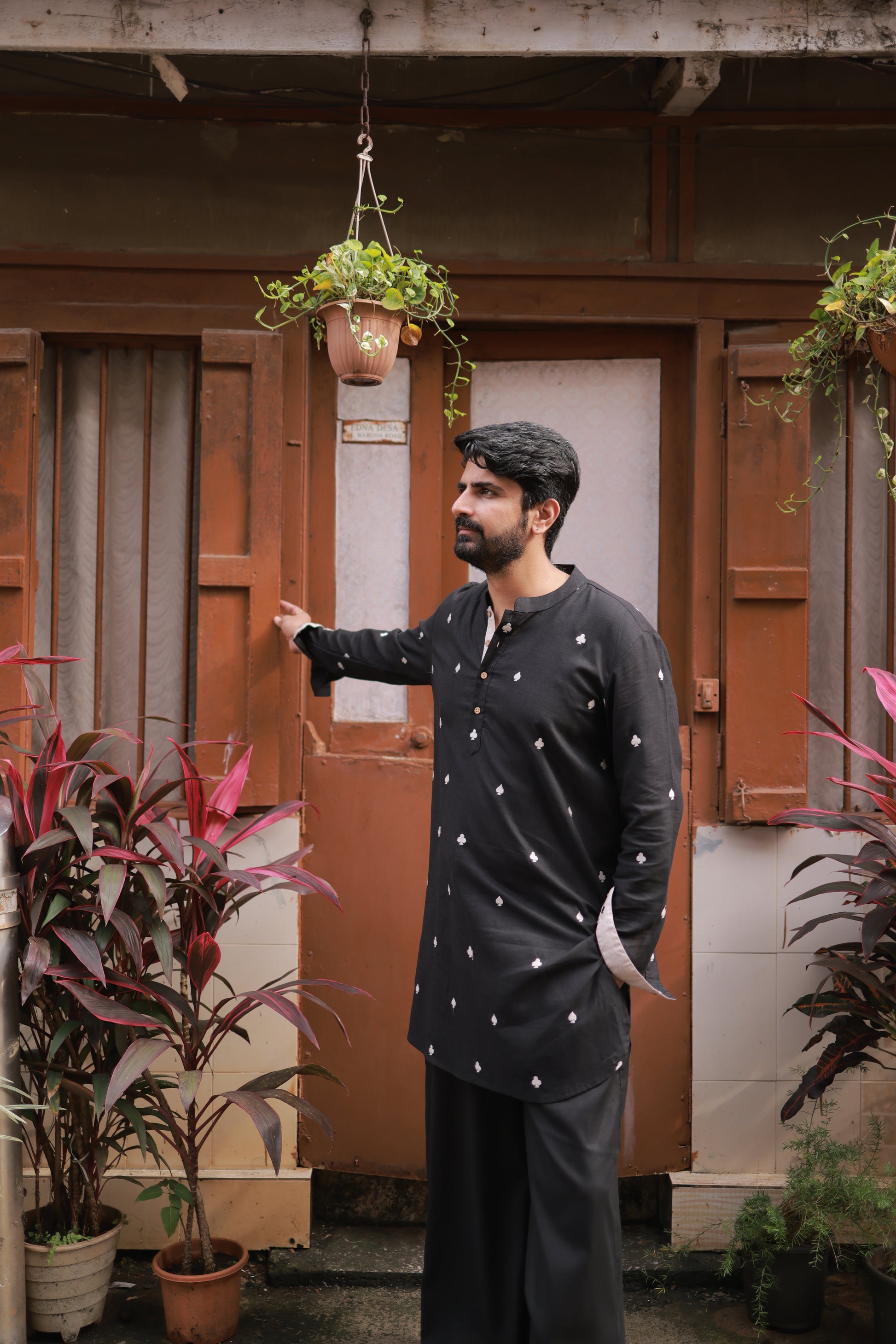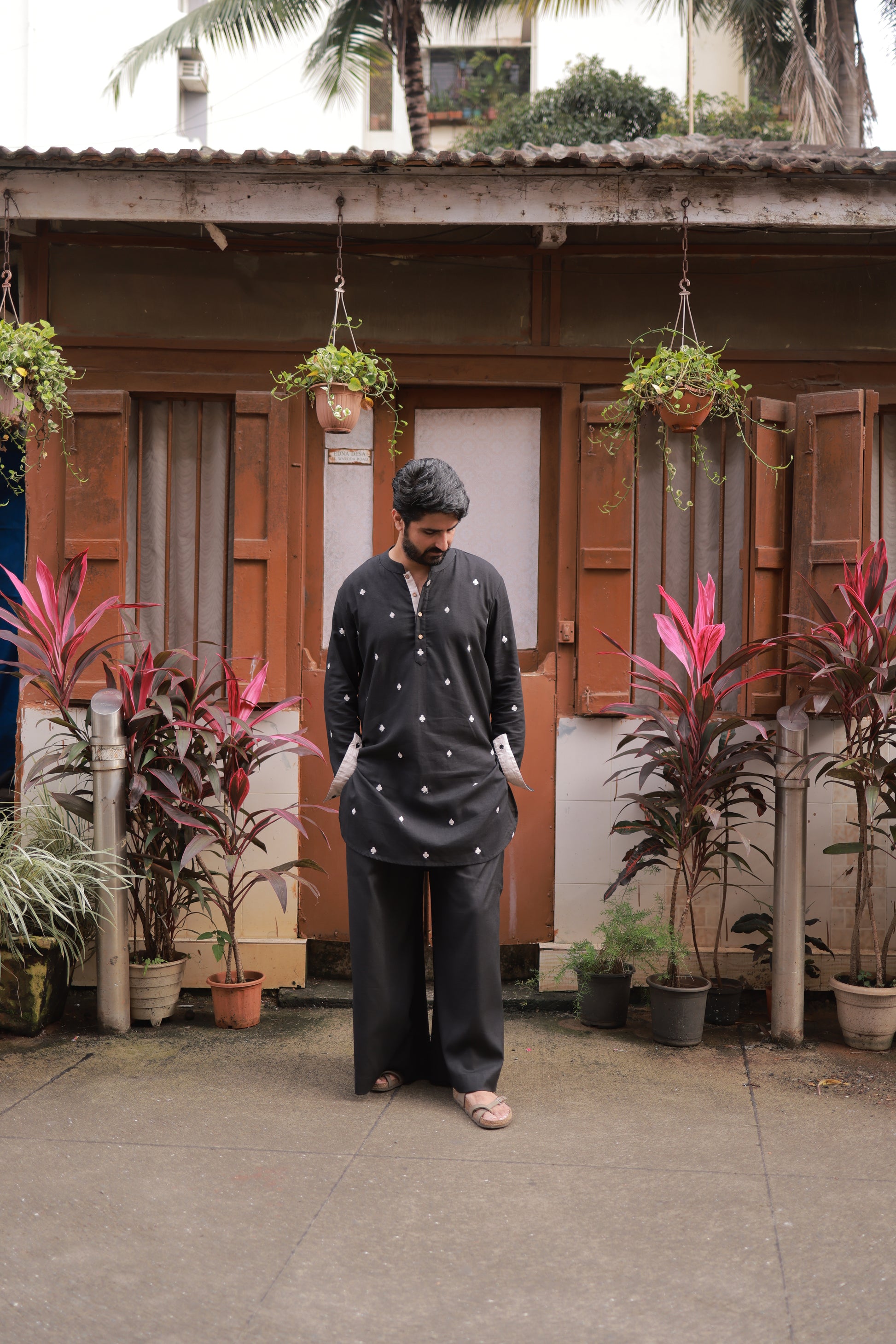 Crafted in a rich linen blend, this kurta is intricately embroidered with spade and club motifs — a subtle nod to festive charm and playful evenings. Paired with wide flared pants, this outfit is designed to keep you comfortable while making you stand out from the crowd at any celebration or cards-night gathering