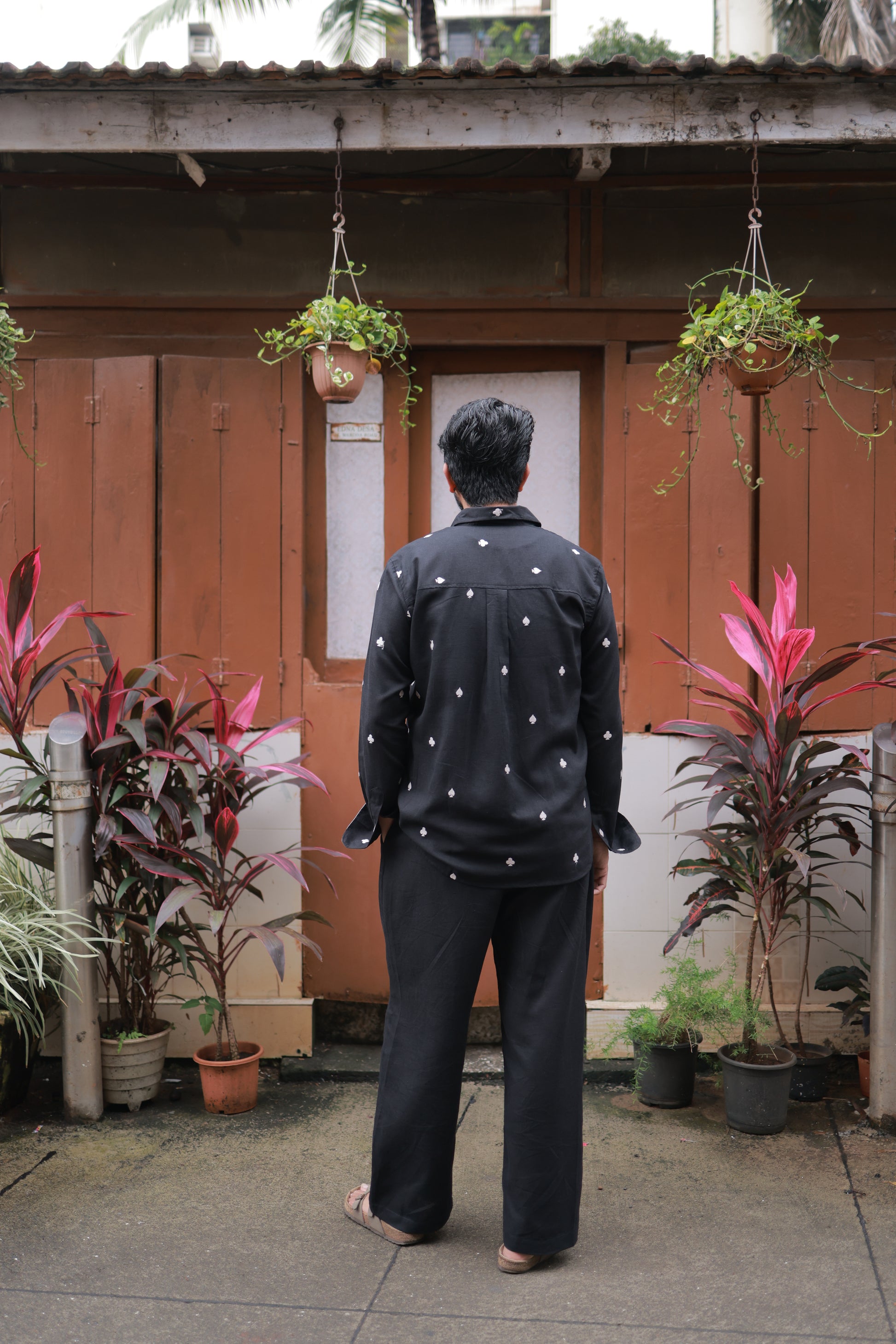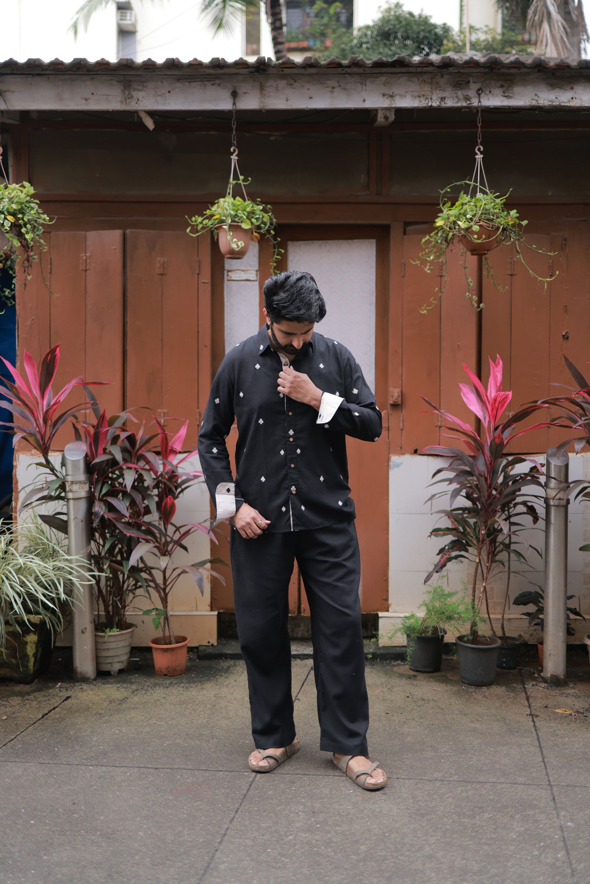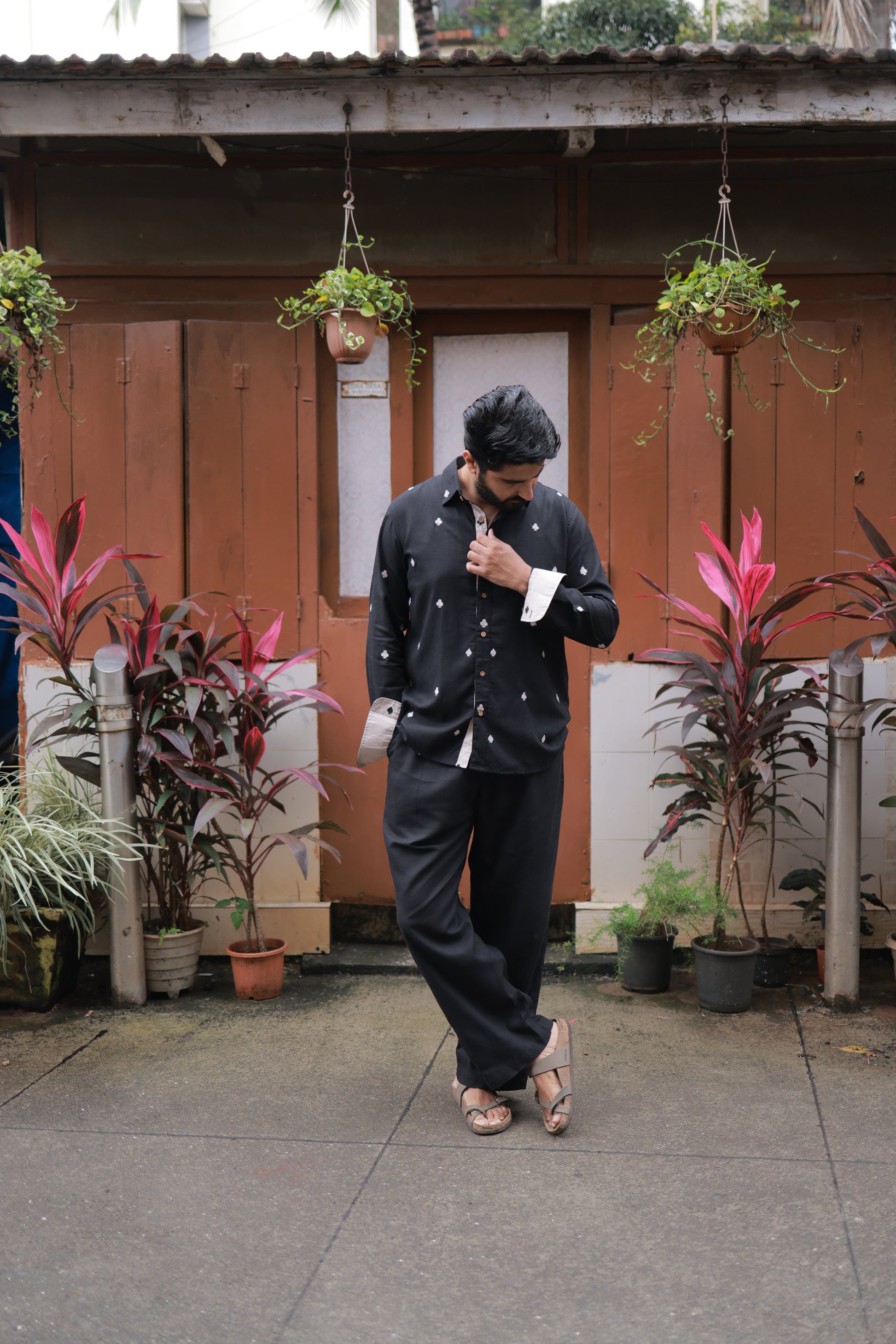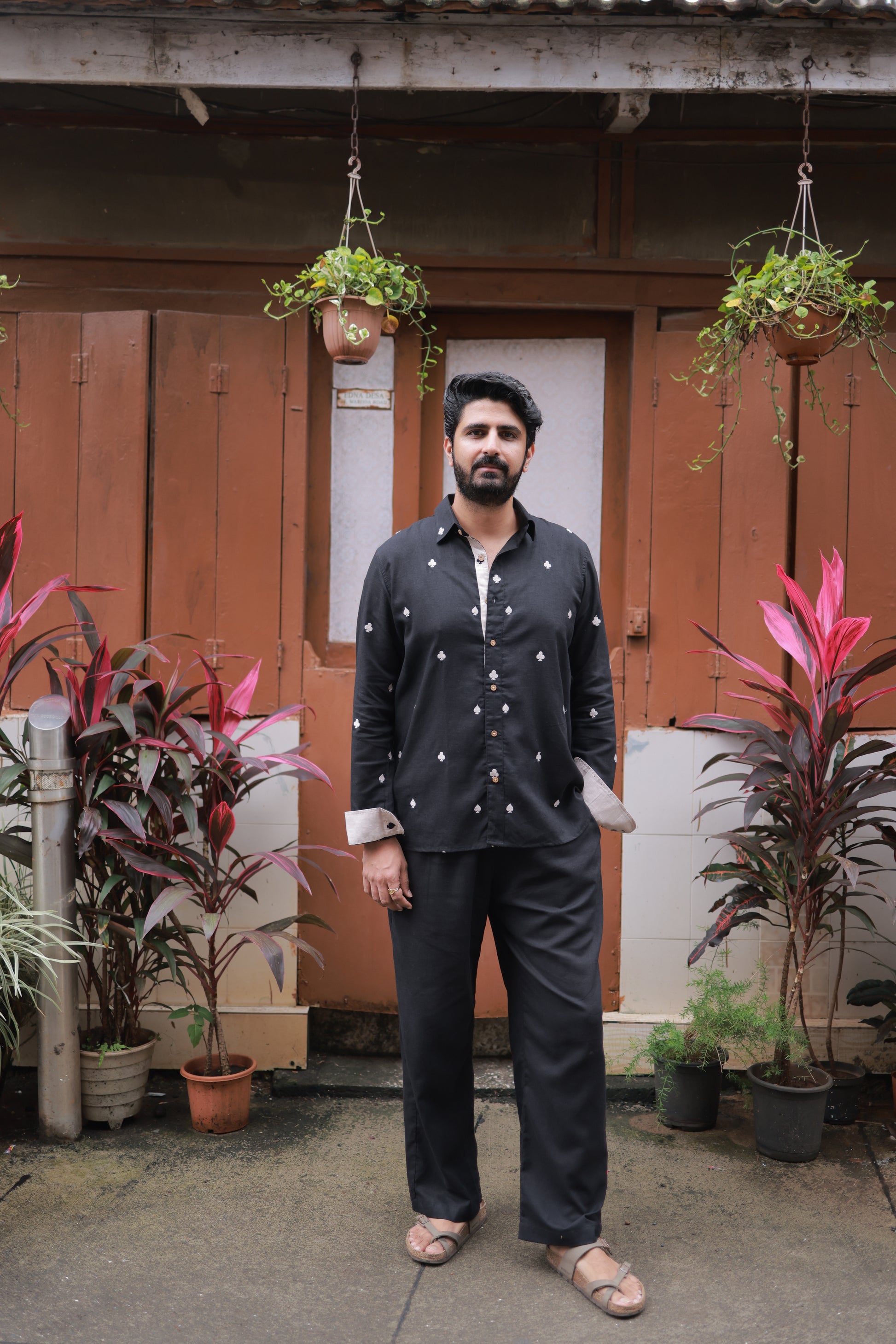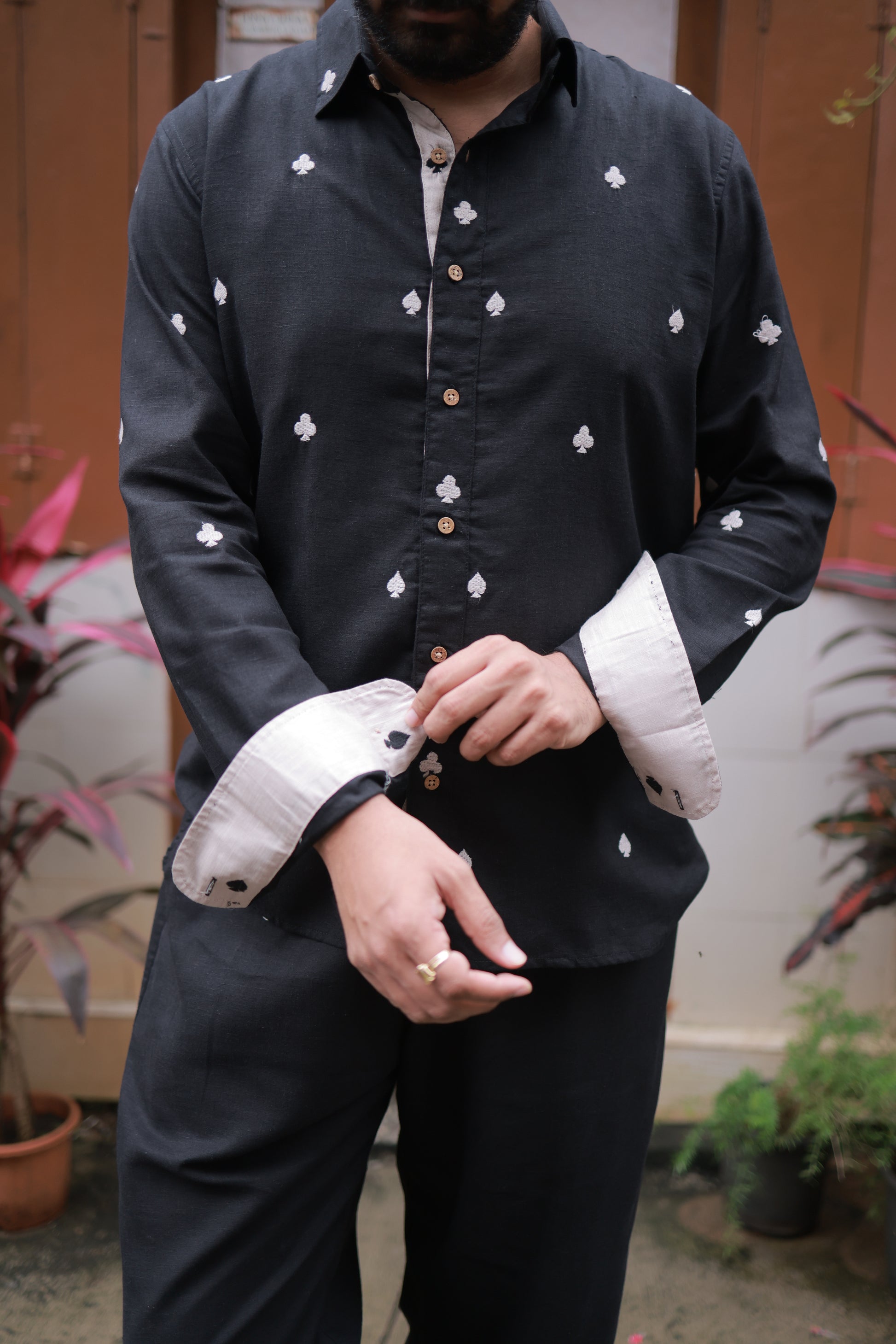 Crafted in a breathable linen , this shirt is delicately embroidered with spade and club motifs. A statement piece that adds a playful yet elegant charm to your festivities — and the ultimate pick for your next cards-night gathering.