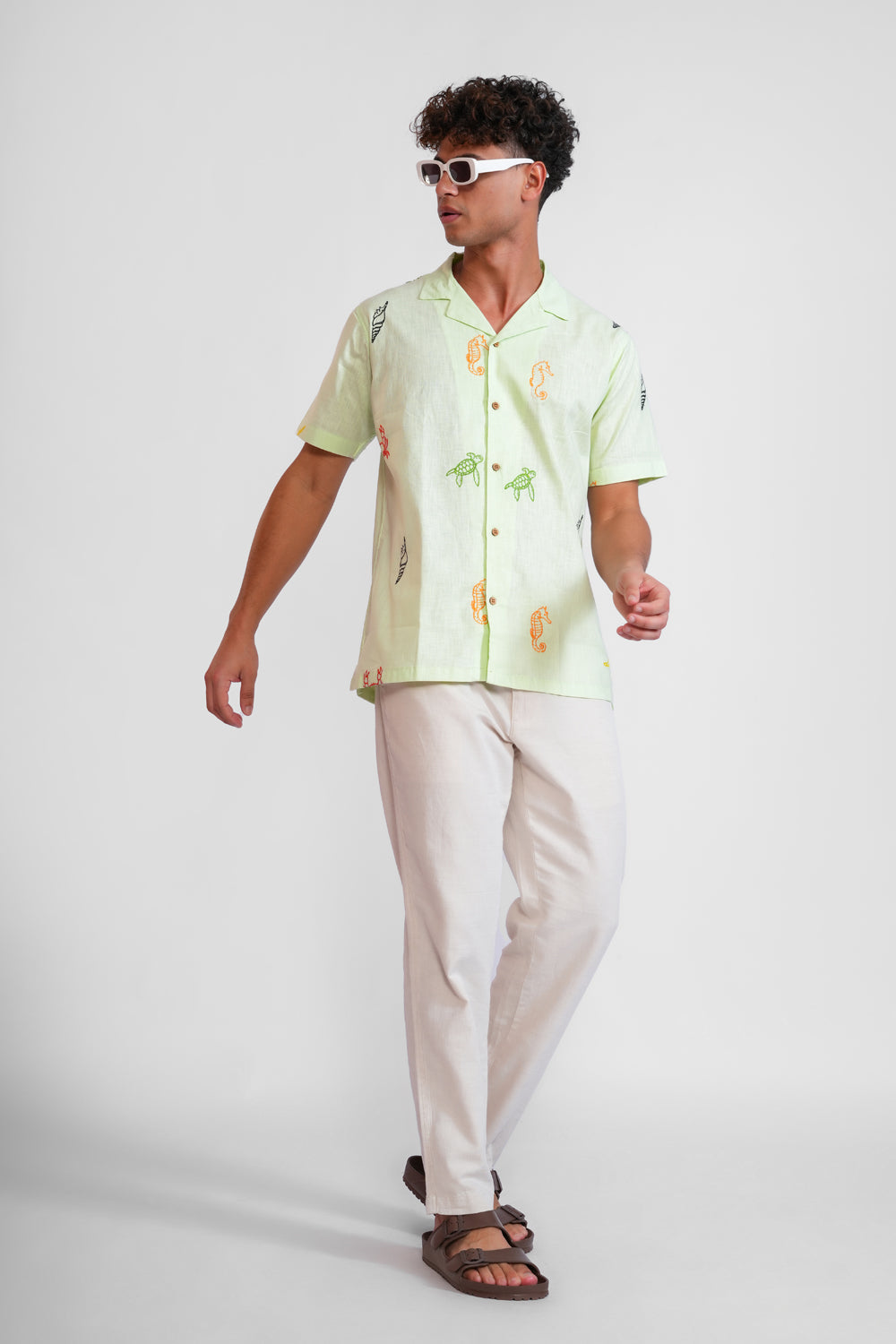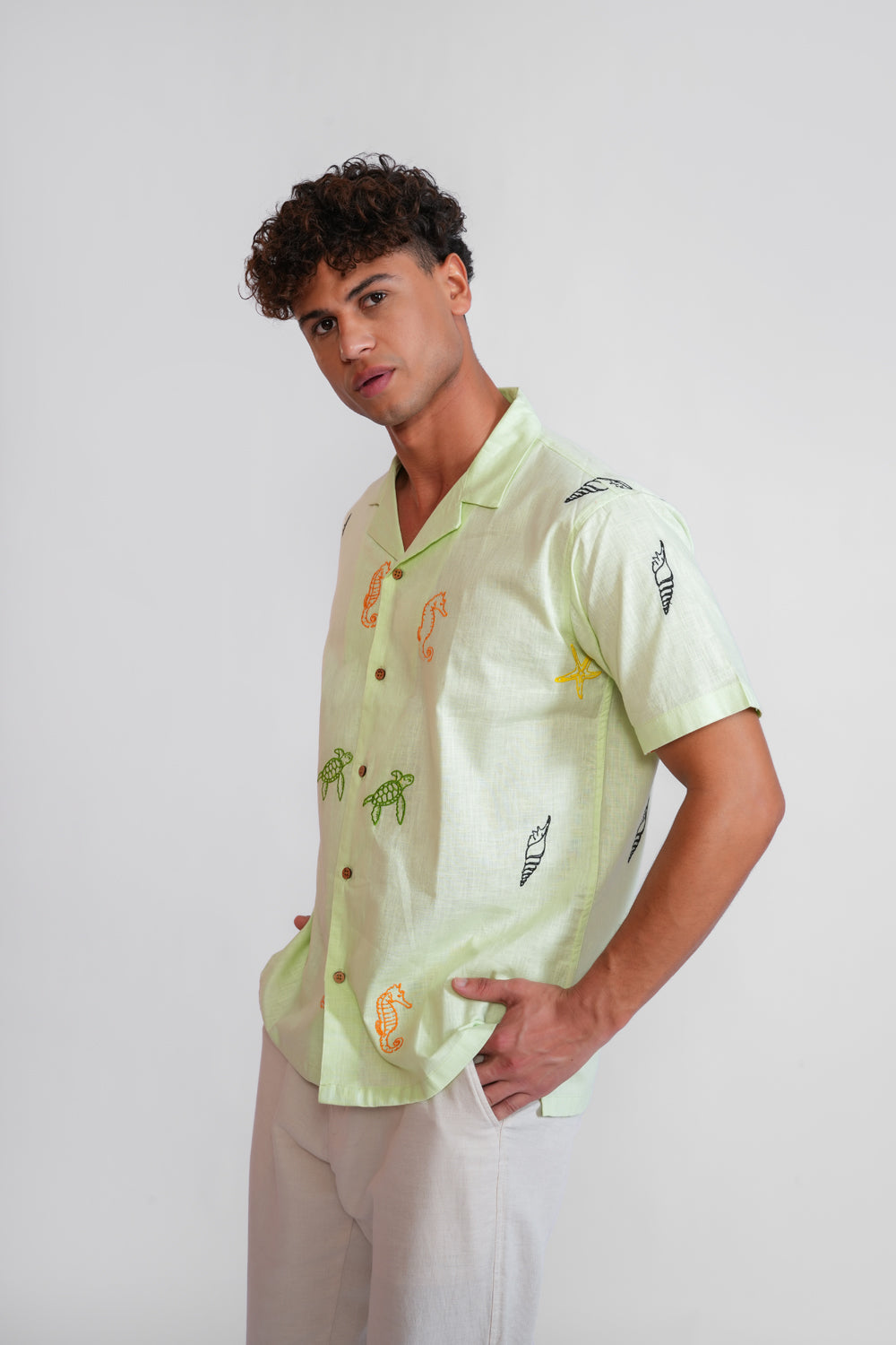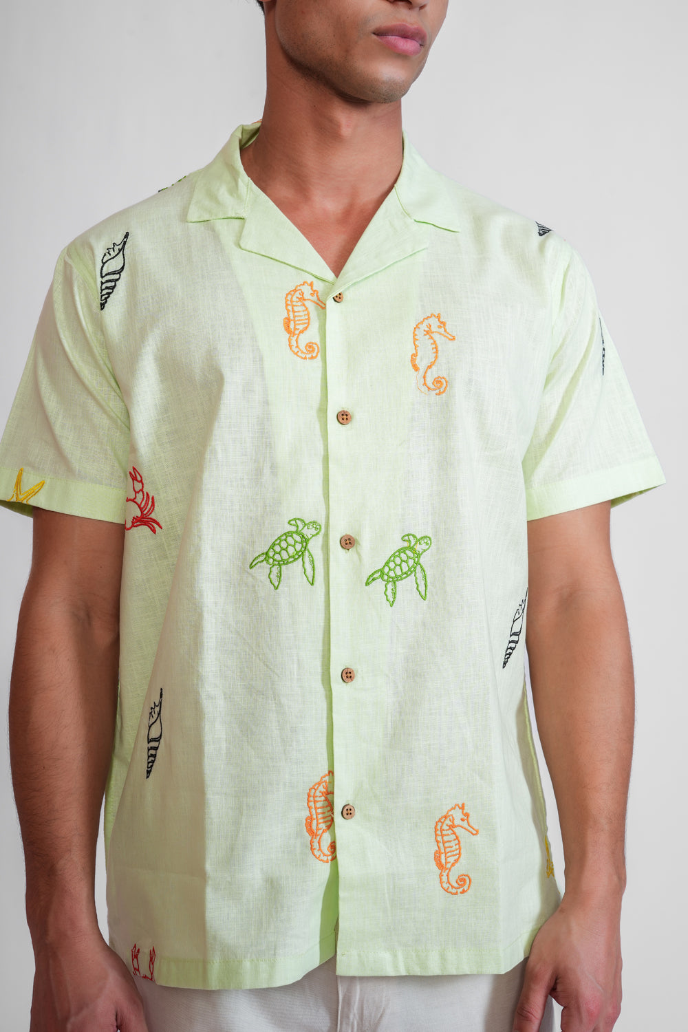 Crafted from 100% pure cotton, this one-of-a-kind shirt showcases intricate embroidery throughout.The shirt is adorned with various sea creatures, creating a vibrant underwater scene. Each design is completely embroidered, making this piece truly unique and perfect for those who appreciate artisanal craftsmanship.