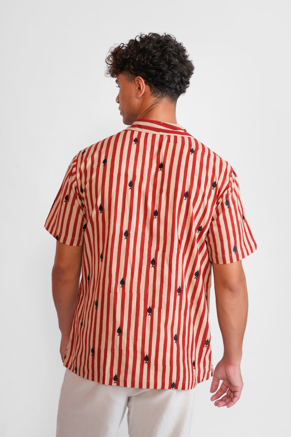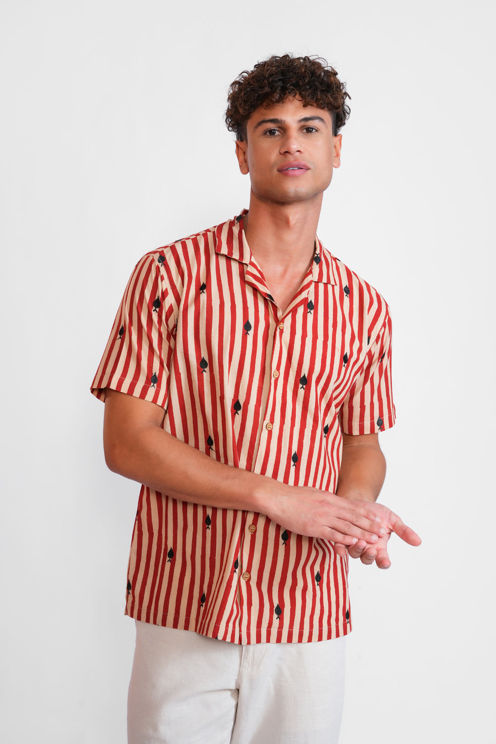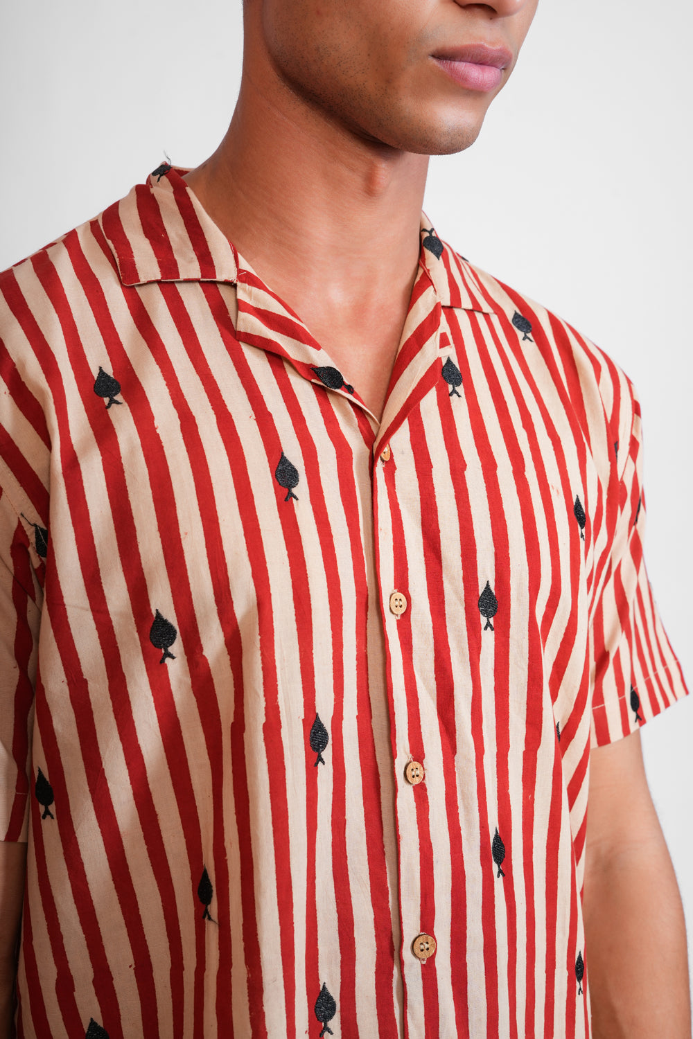 This Cuban collar shirt combines the elegance of block-printed red and off-white stripes with intricately embroidered spades, creating a striking visual appeal. Perfectly suited for Diwali parties, card game nights, or even casual outings, this shirt offers a blend of festive flair and everyday style. Its unique design and fine craftsmanship make it a must-have for those looking to stand out effortlessly.