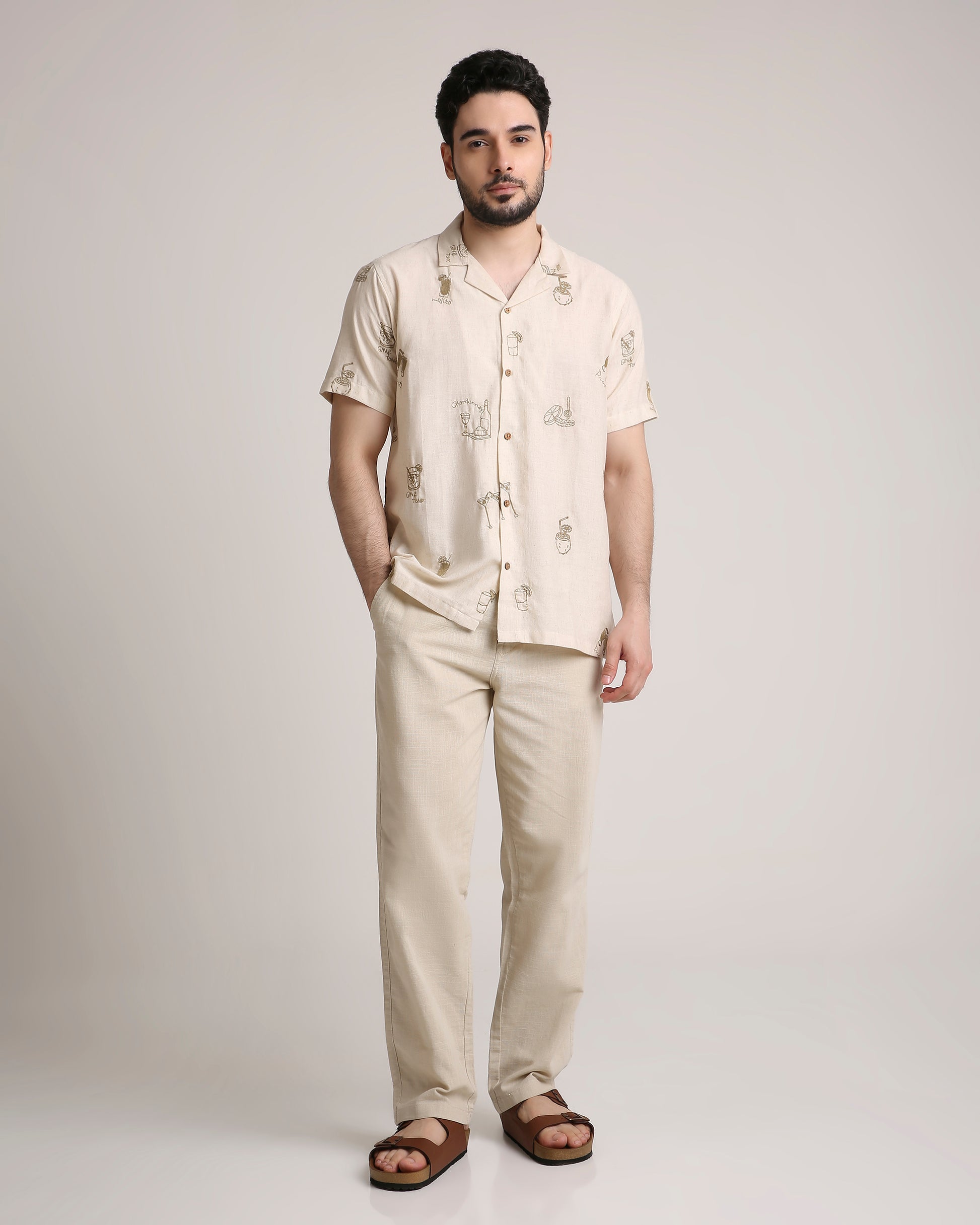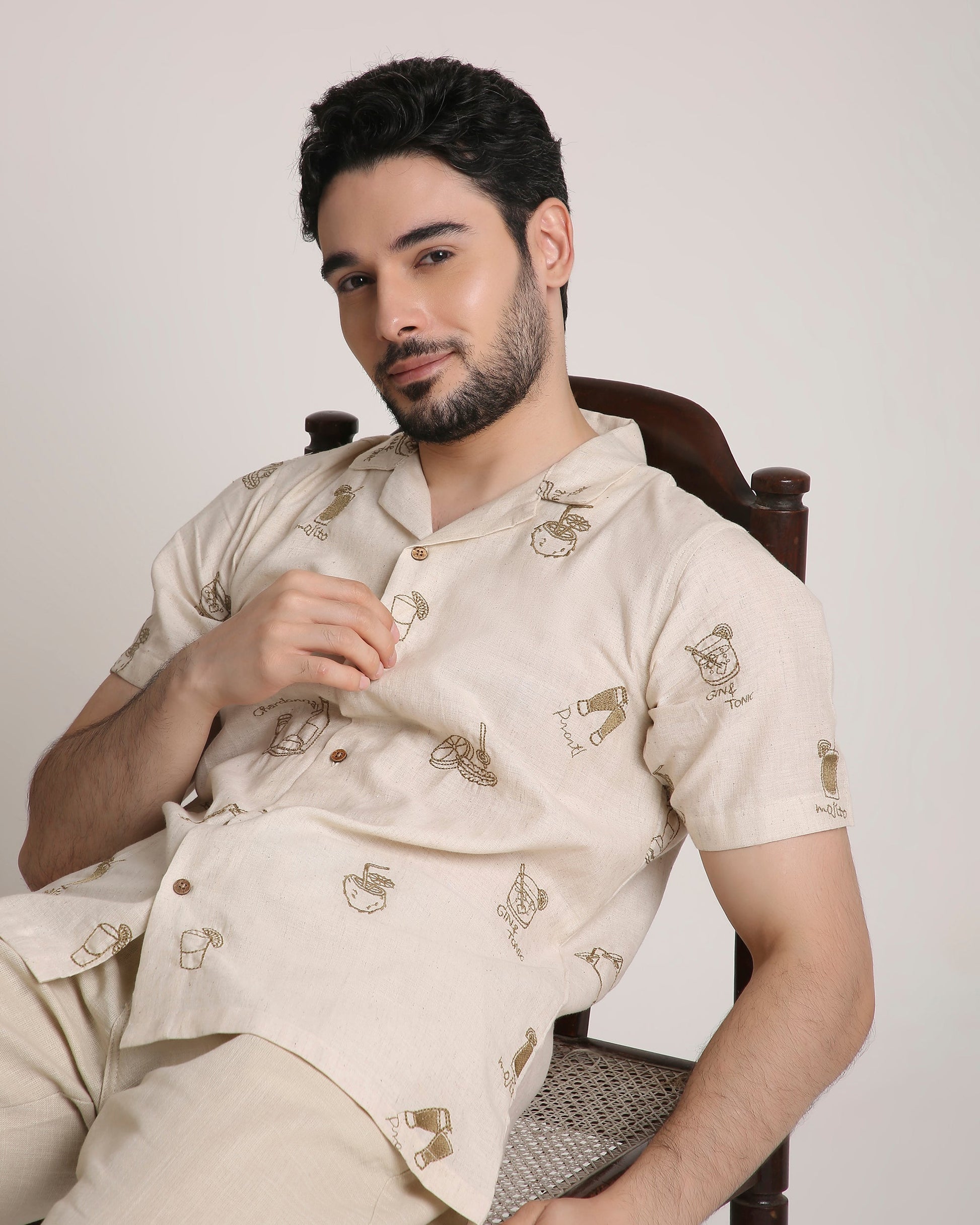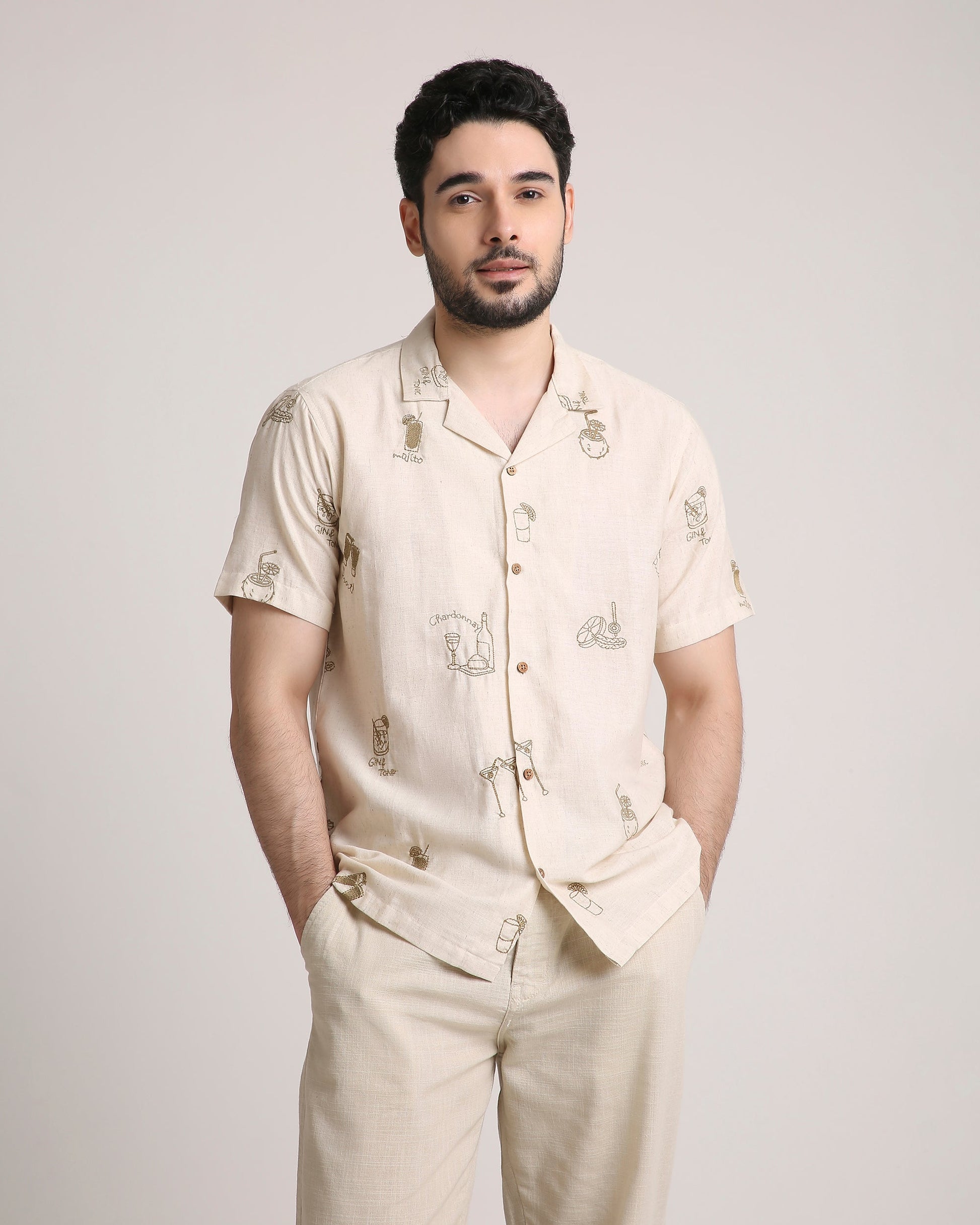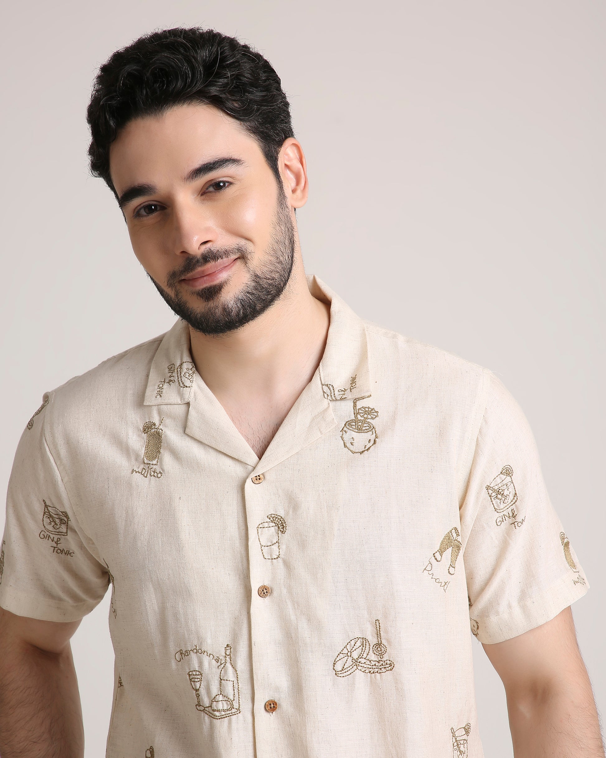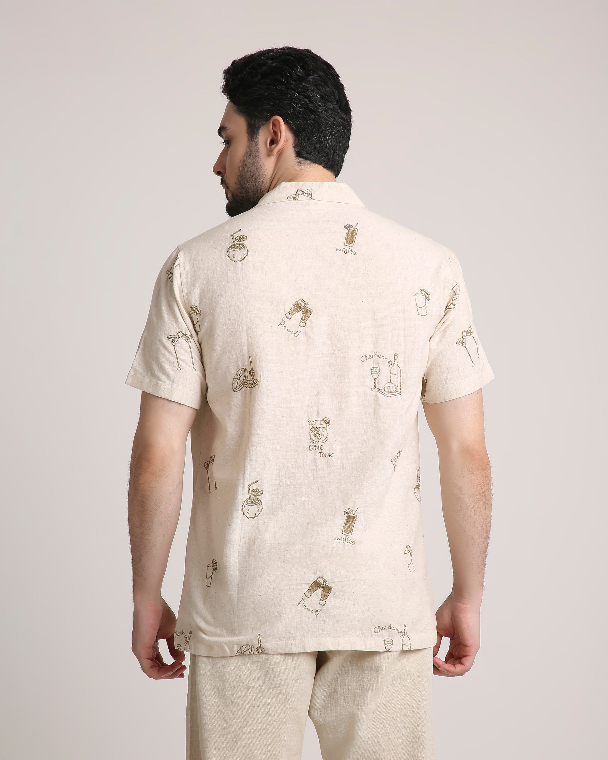 Turn heads at every party with our Friday Night Shirt, featuring exquisite embroidery of iconic cocktails—Mojito, Gin & Tonic, and more. Made from pure cotton, it offers unmatched comfort with a touch of playful sophistication. Perfect for your next night out, this statement piece is a must-have for cocktail lovers and trendsetters alike.