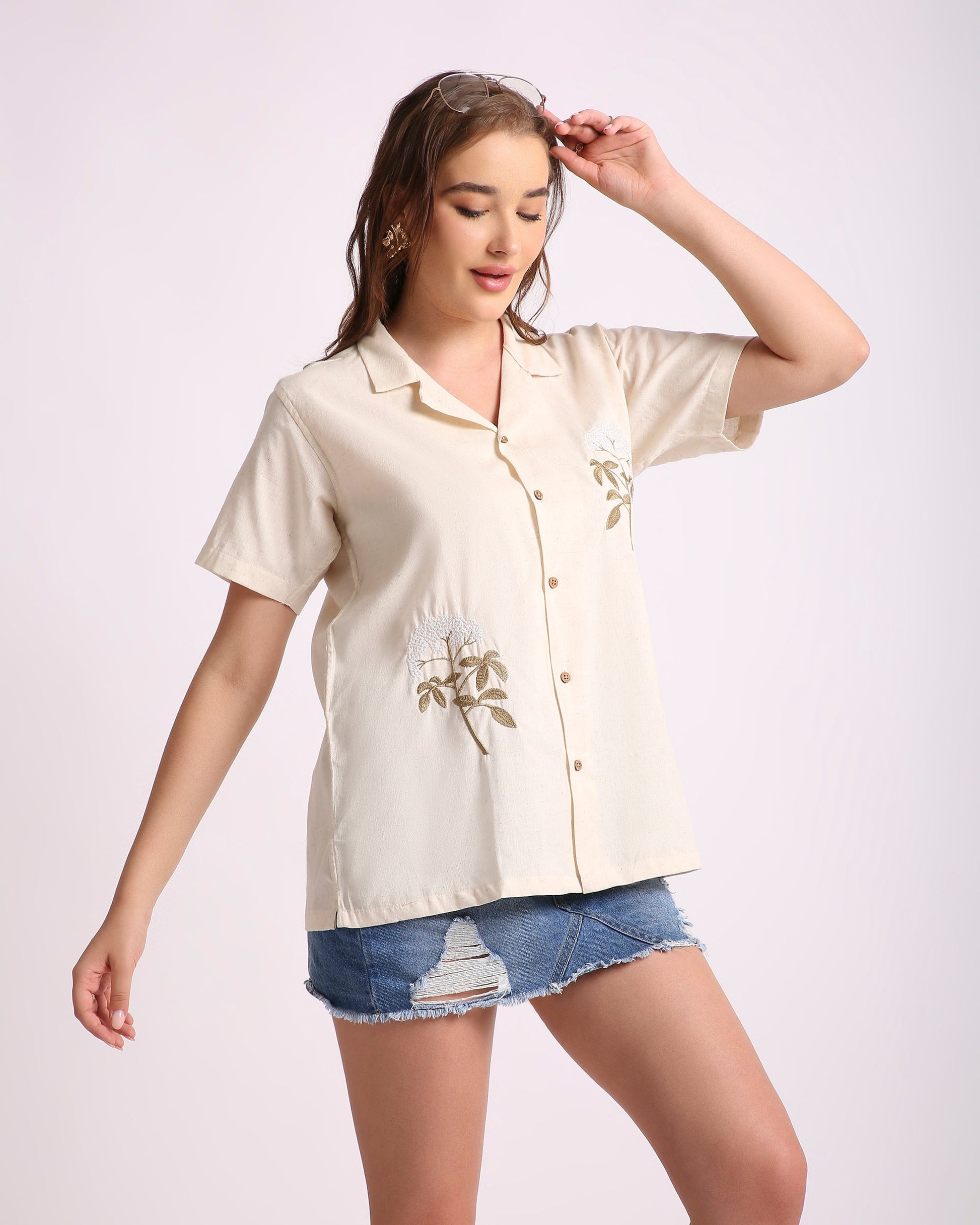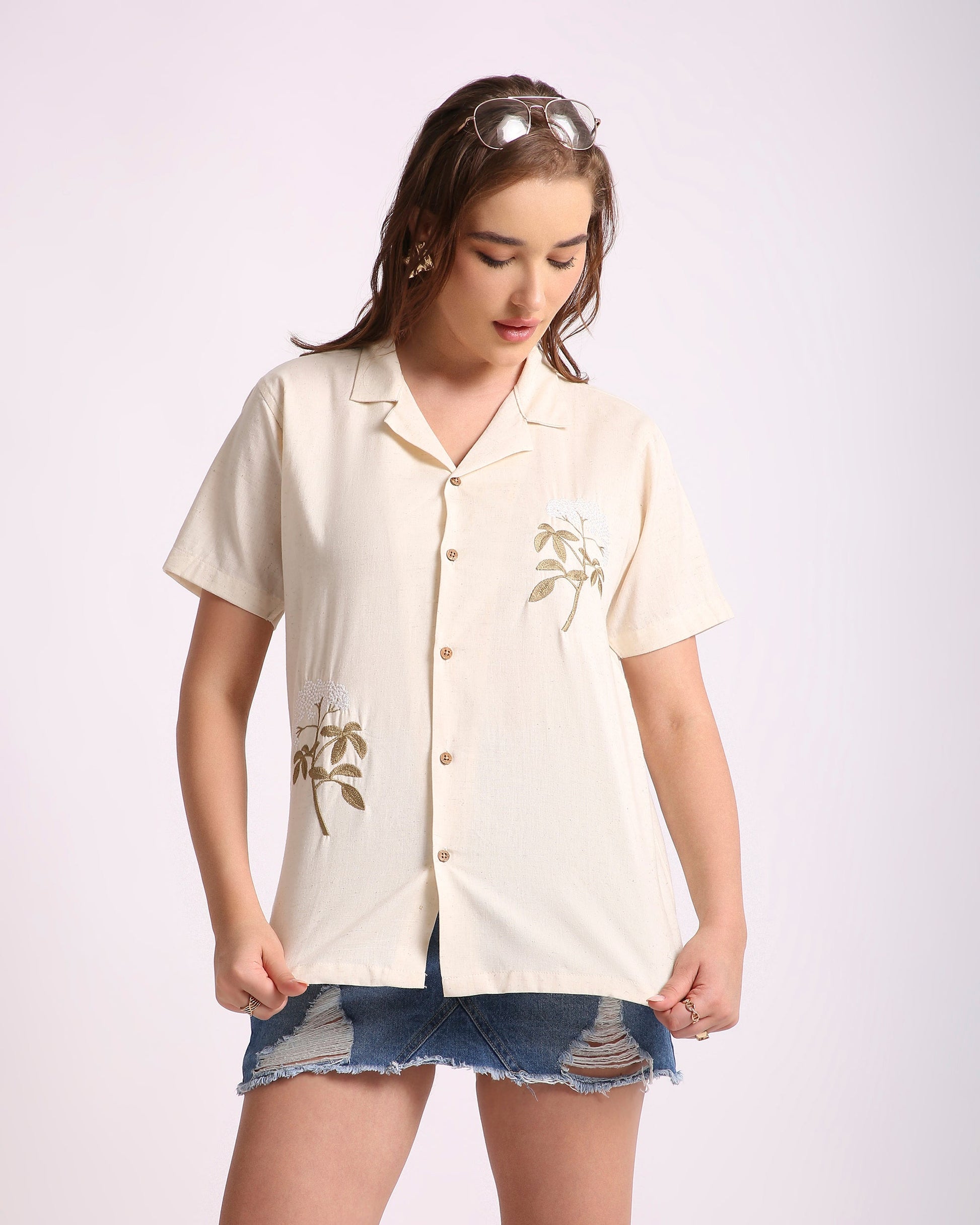 Elevate your wardrobe with the understated elegance of the Ivory Bloom Unisex Shirt. Made from a luxurious pure cotton-linen blend, this breathable shirt features delicate floral embroidery in earthy tones, offering a refined yet natural aesthetic. With its relaxed silhouette, wooden buttons, and classic camp collar, it’s designed for effortless wear across all seasons. A versatile staple for anyone who values comfort, craftsmanship, and timeless style—perfect for casual days, creative workspaces, or warm evening gatherings.