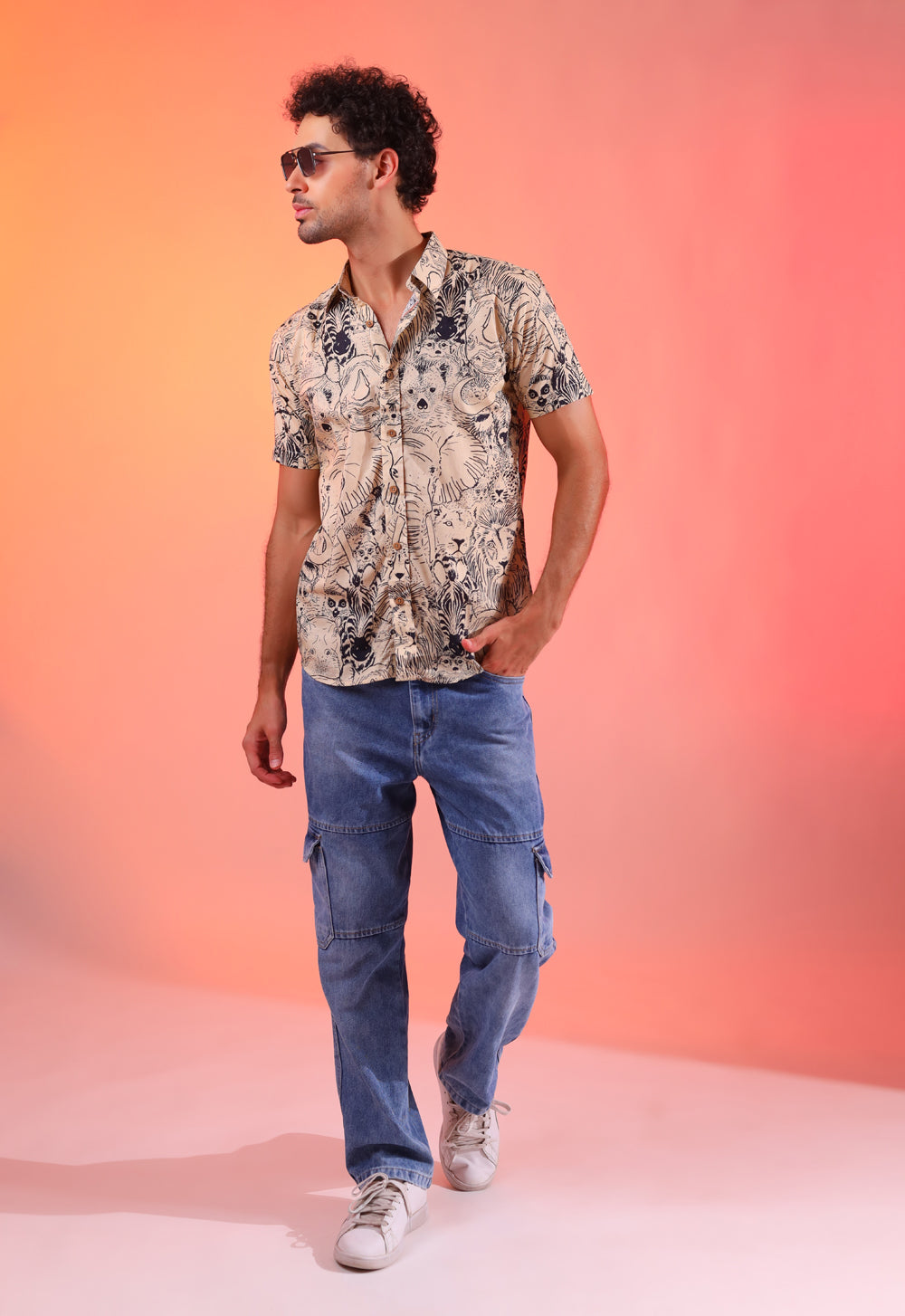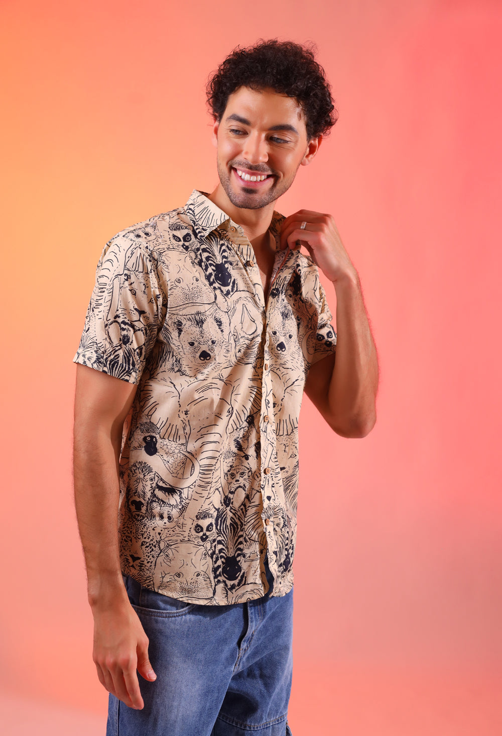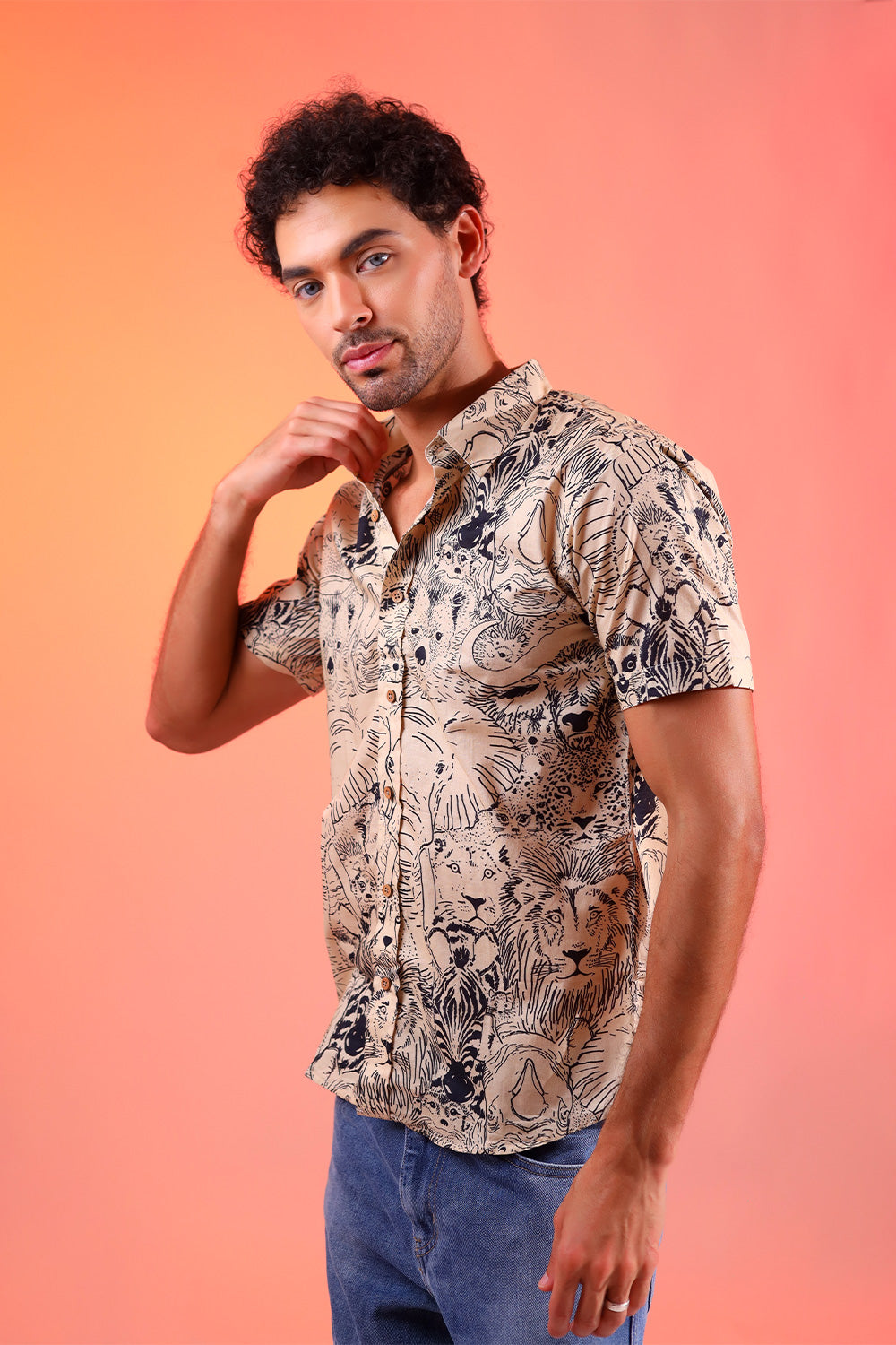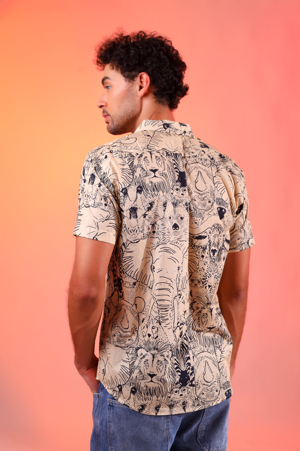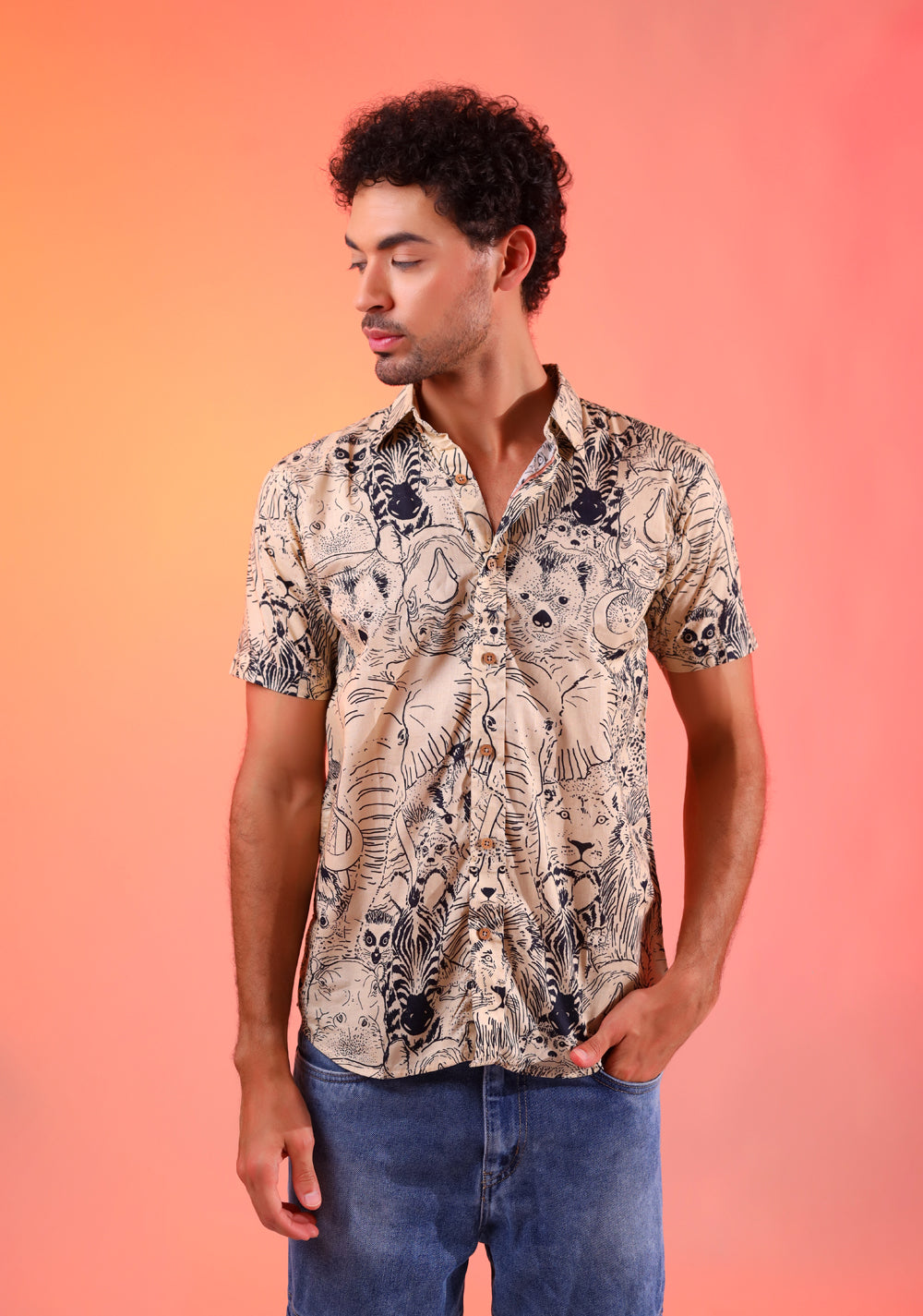 The Jungle Roar Shirt is digitally printed on pure cotton, featuring a vibrant array of jungle animals. This unique design brings the wild to your wardrobe, offering both comfort and style in one exclusive piece.