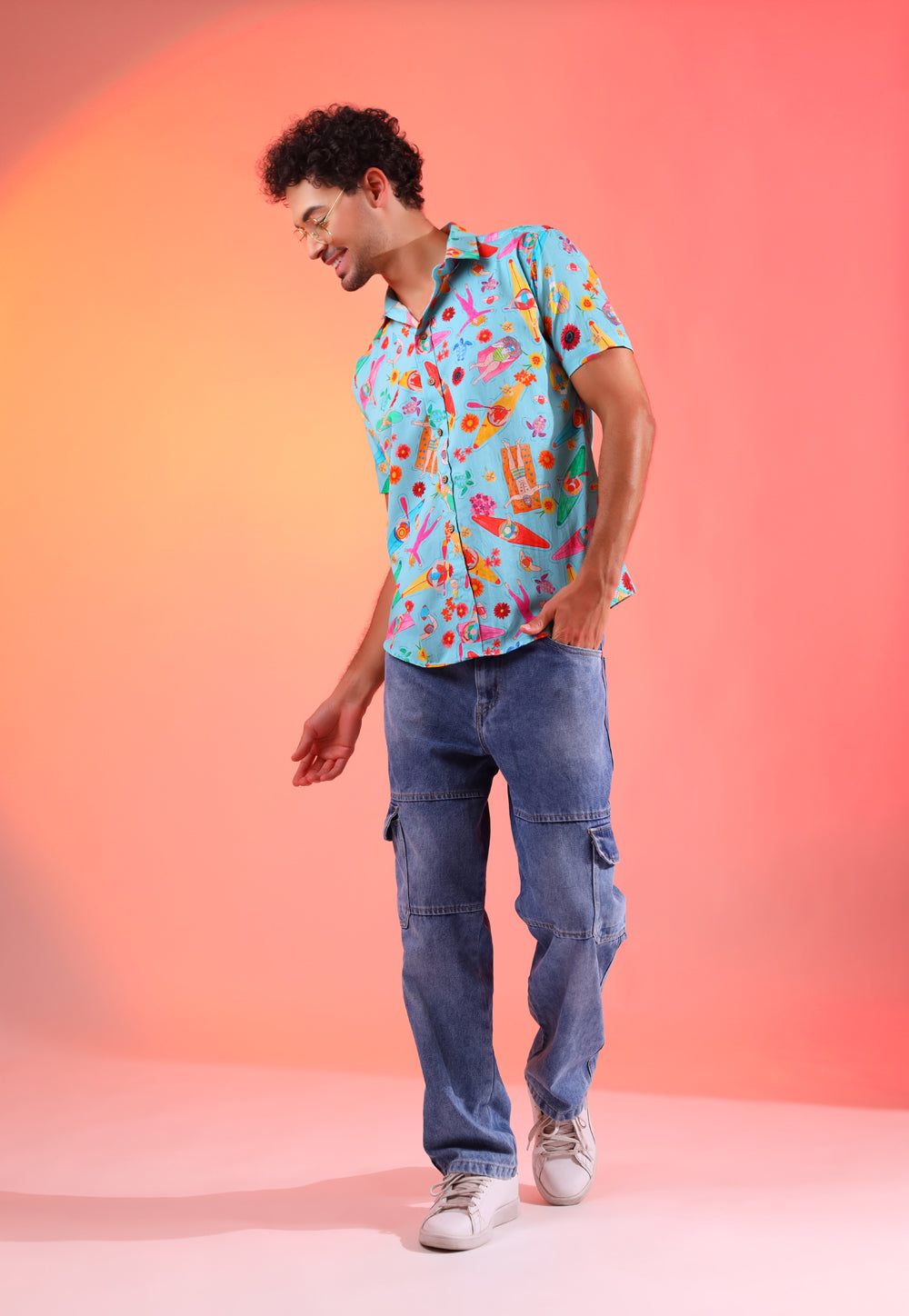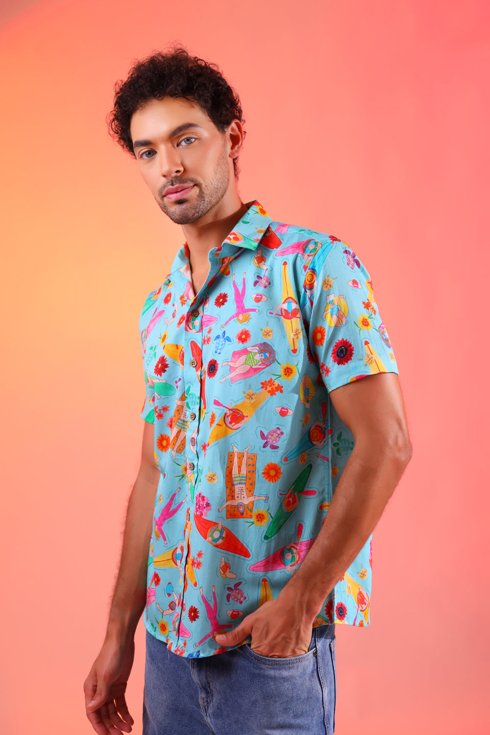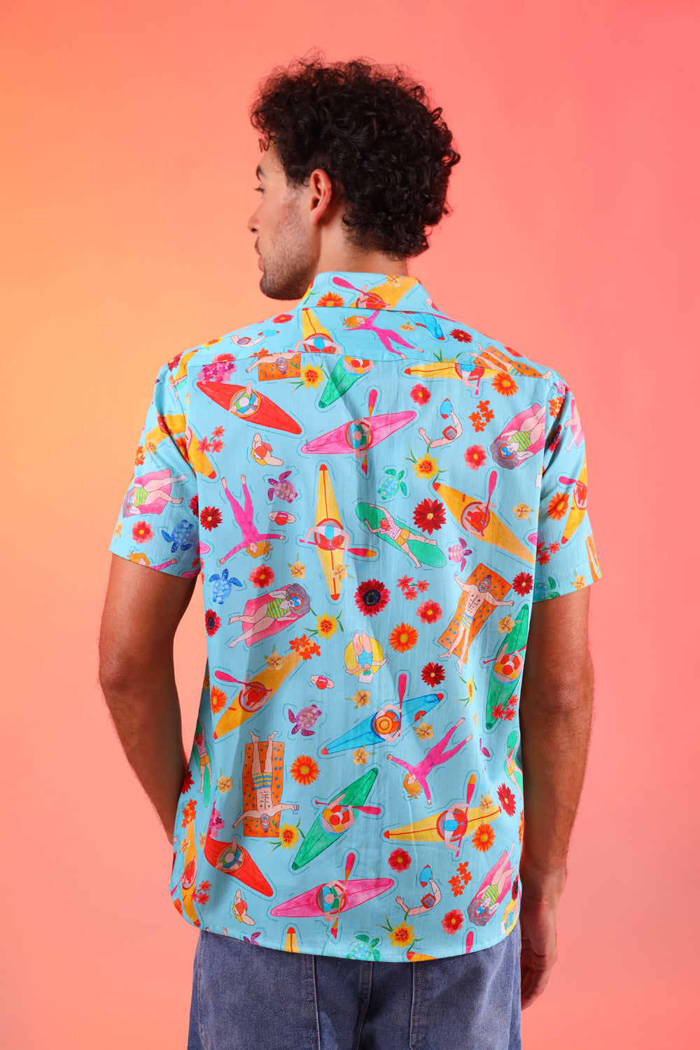 The Kayaking Shirt is our exclusive print, featuring vibrant summer elements where people are having fun in the water, including kayaking, swimming, and chilling. Made from pure cotton, this shirt combines comfort with style. Designed by us and digitally printed, it promises to be an exclusive addition to your wardrobe.