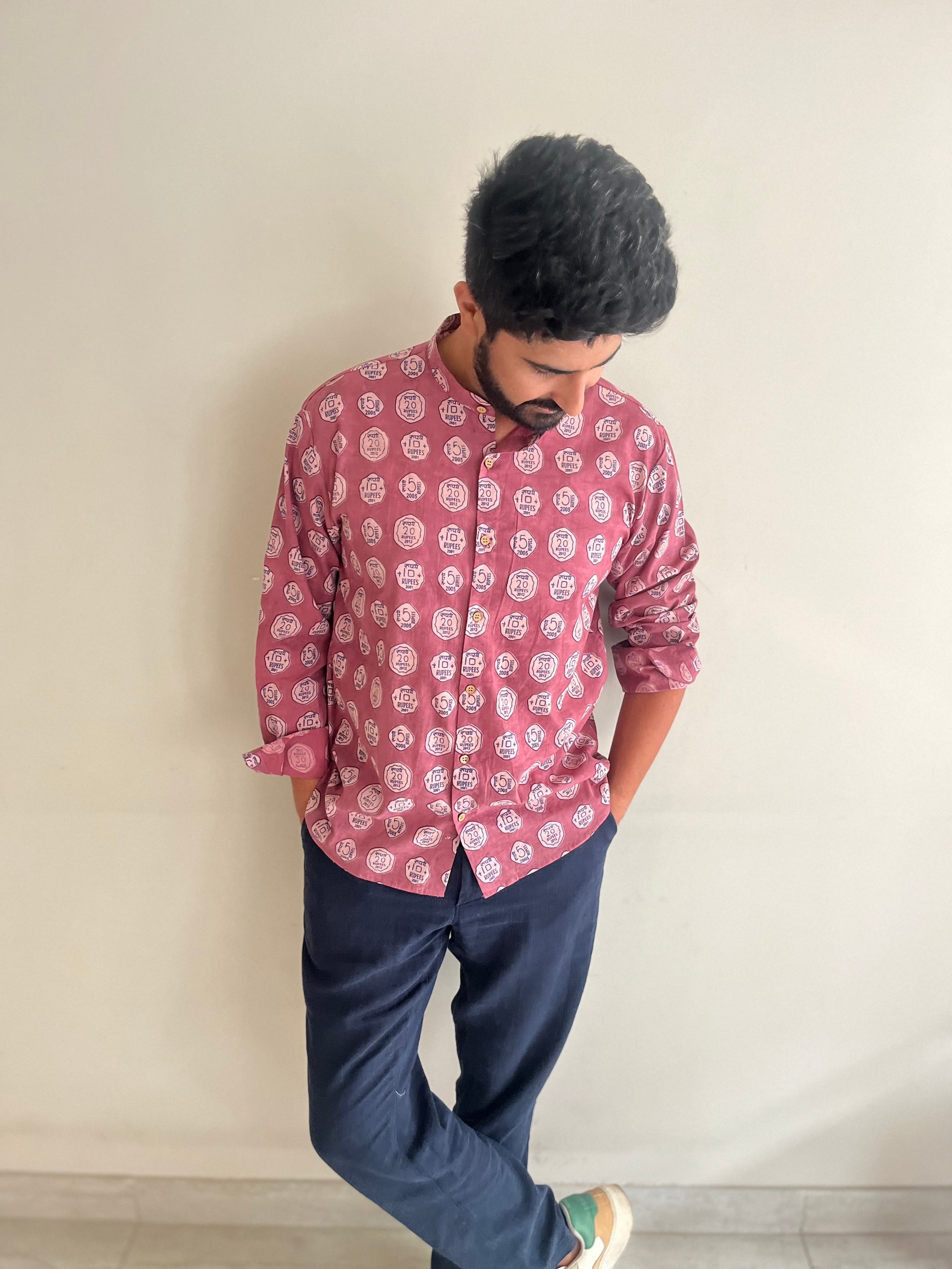 "Introducing our 'Khotte Sikke' Shirt, a unique and culturally inspired garment that pays homage to the rich history of Indian currency. This shirt features an intricate hand block printed design showcasing Indian coins from different years, adding a touch of vintage charm and historical significance to your wardrobe.