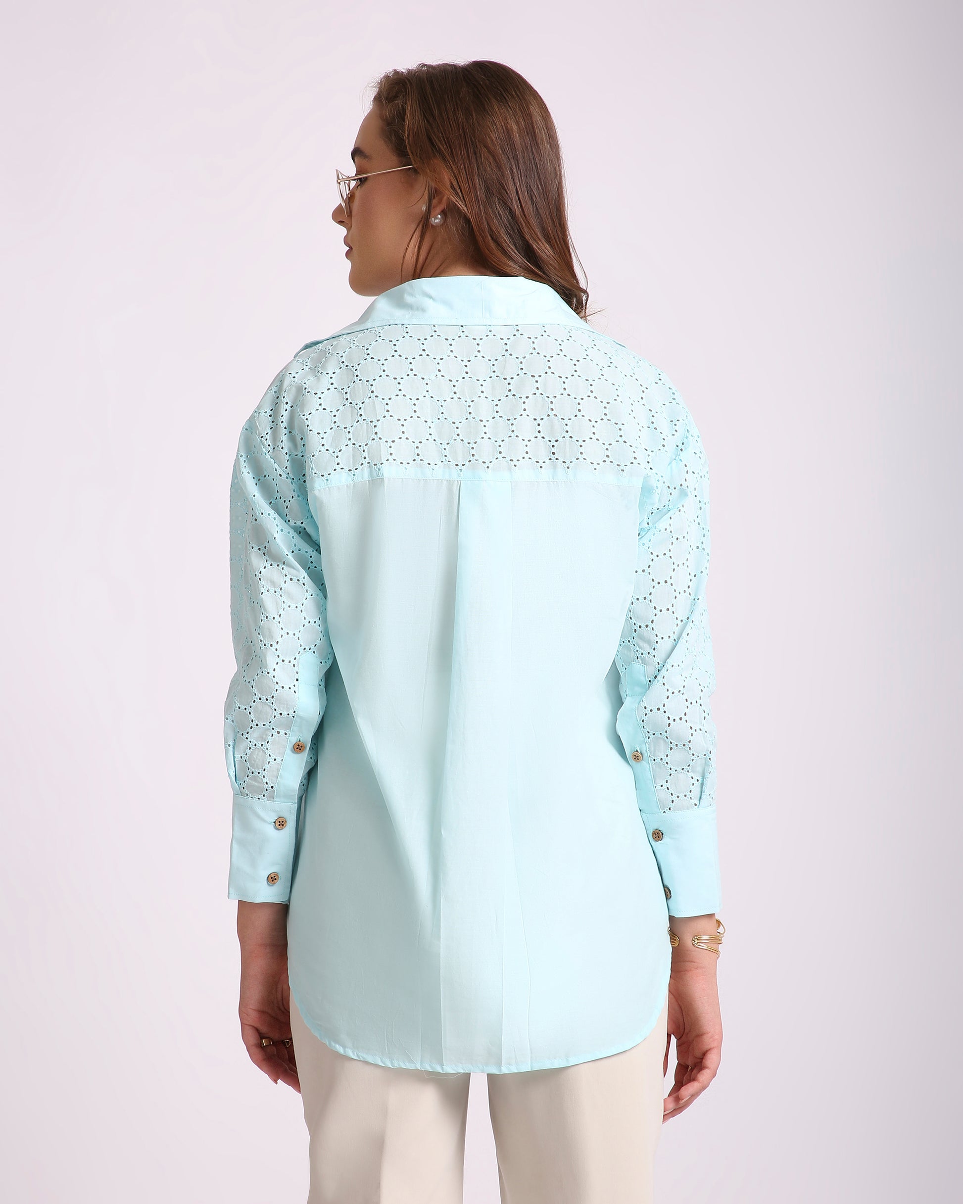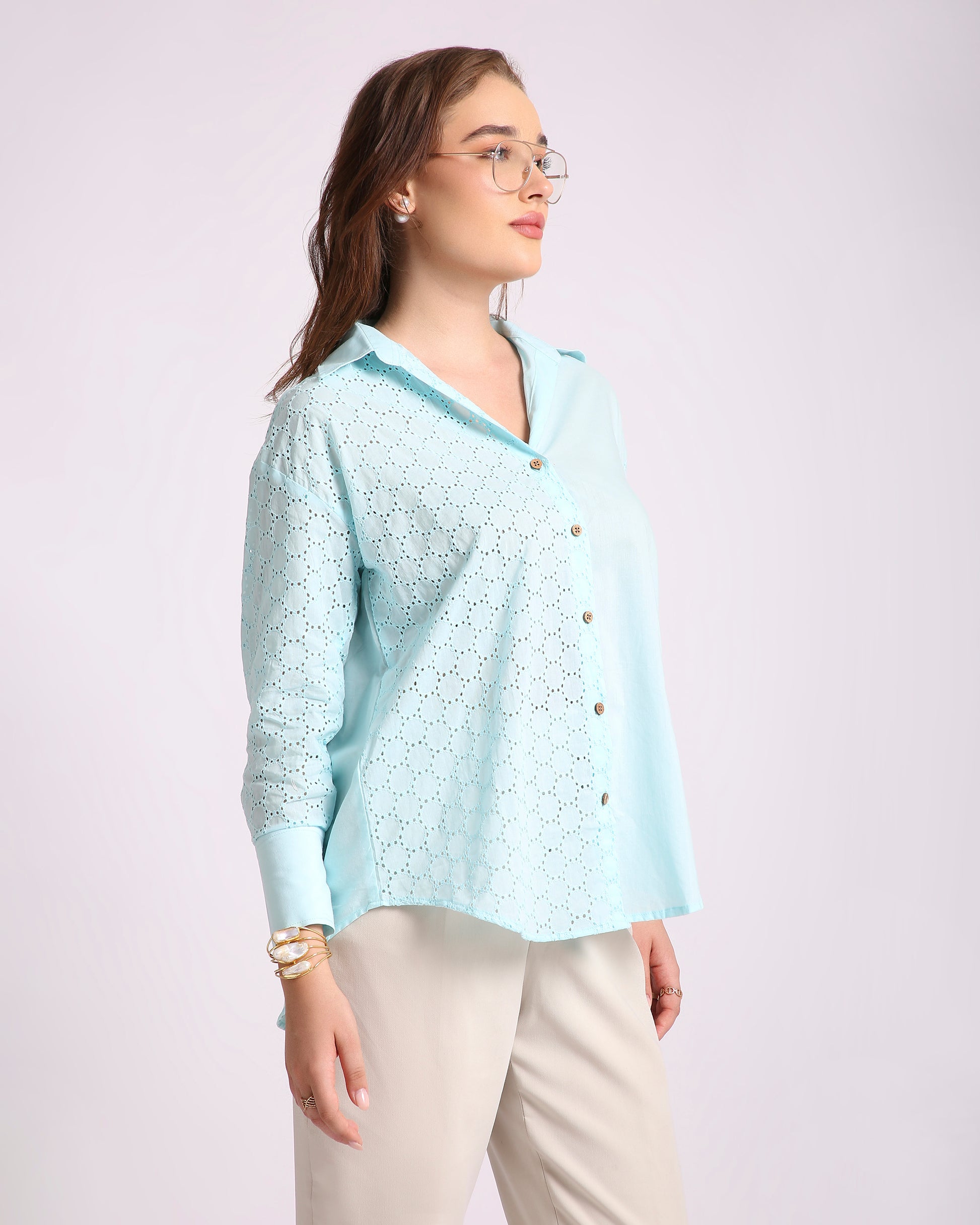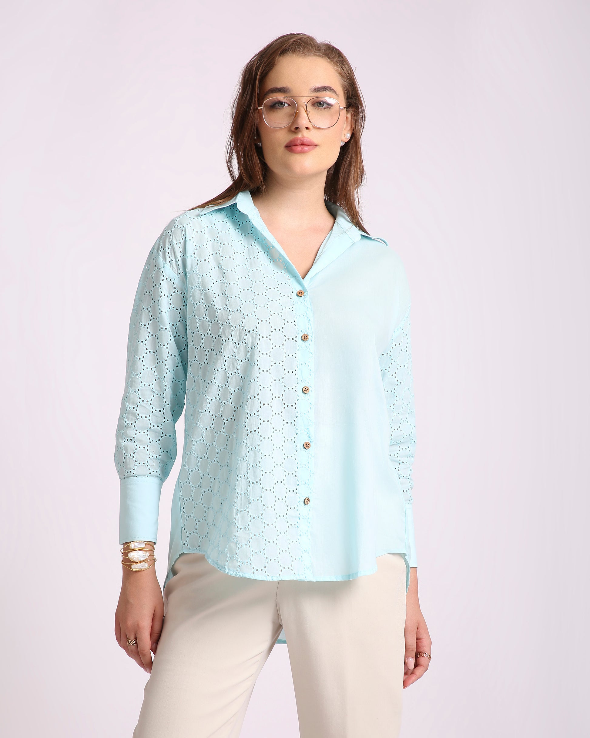 Channel breezy elegance with the Ocean Haze Hakoba Shirt, crafted from 100% pure cotton and delicately detailed with classic Hakoba (eyelet) embroidery. This oversized silhouette with a drop-shoulder design offers a relaxed yet refined look, perfect for summer days or resort evenings. Its serene aqua tone and artisanal texture bring a soft charm to your everyday style.