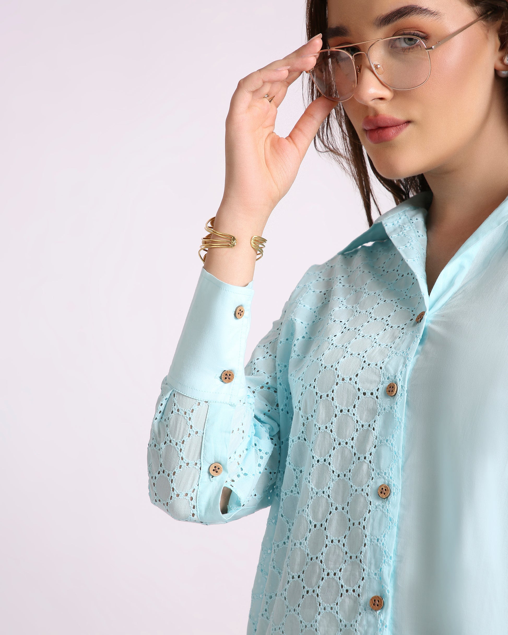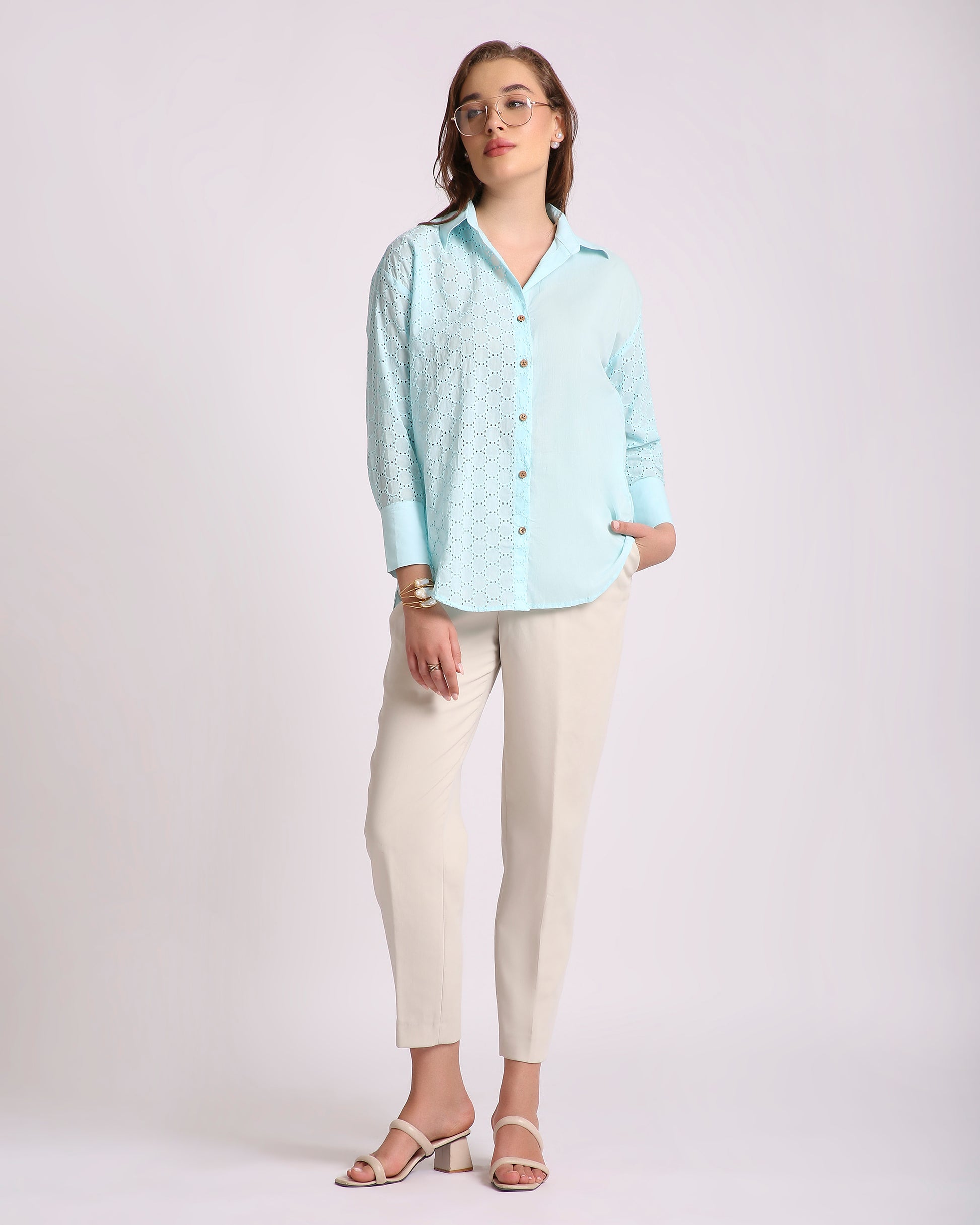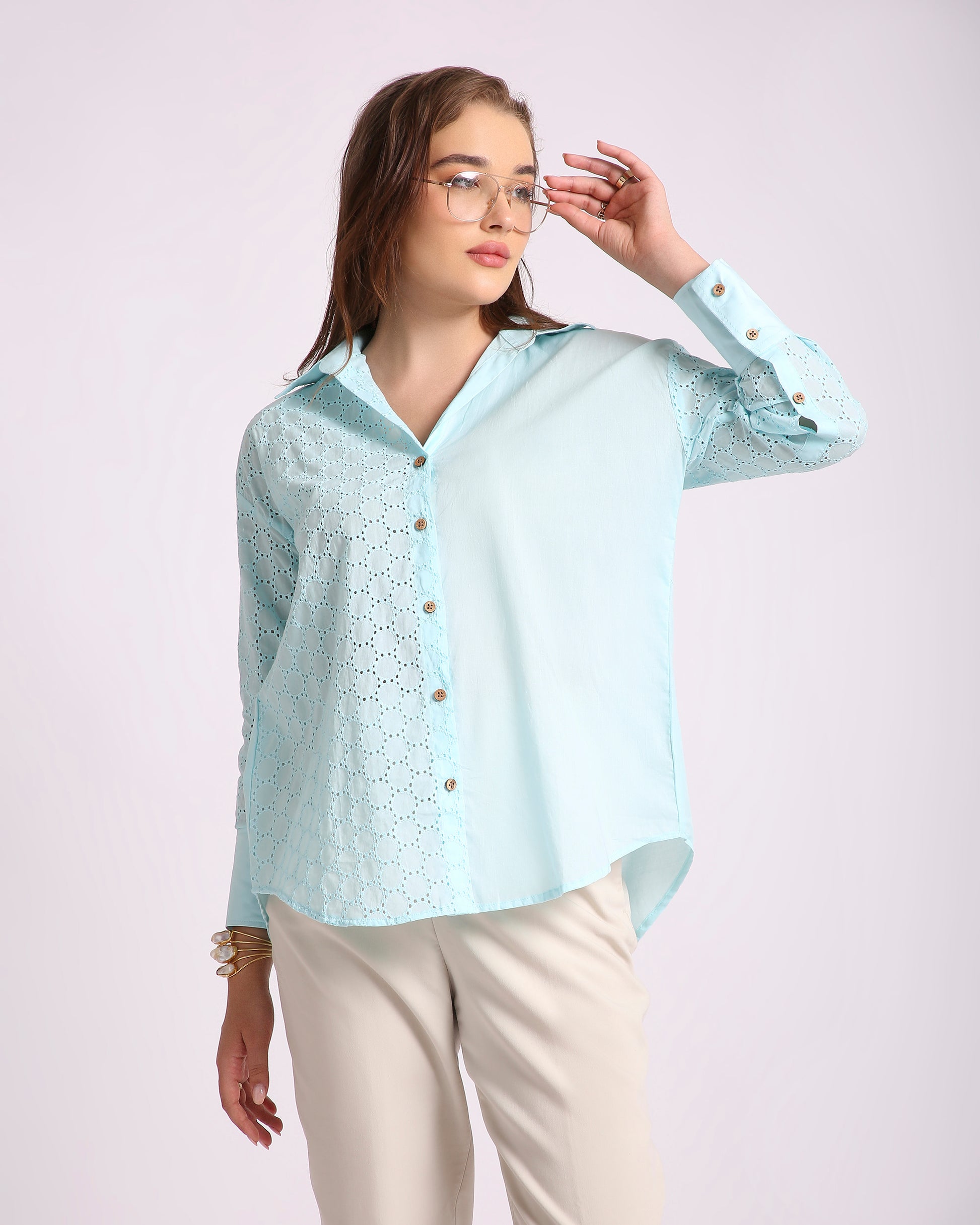 Channel breezy elegance with the Ocean Haze Hakoba Shirt, crafted from 100% pure cotton and delicately detailed with classic Hakoba (eyelet) embroidery. This oversized silhouette with a drop-shoulder design offers a relaxed yet refined look, perfect for summer days or resort evenings. Its serene aqua tone and artisanal texture bring a soft charm to your everyday style.