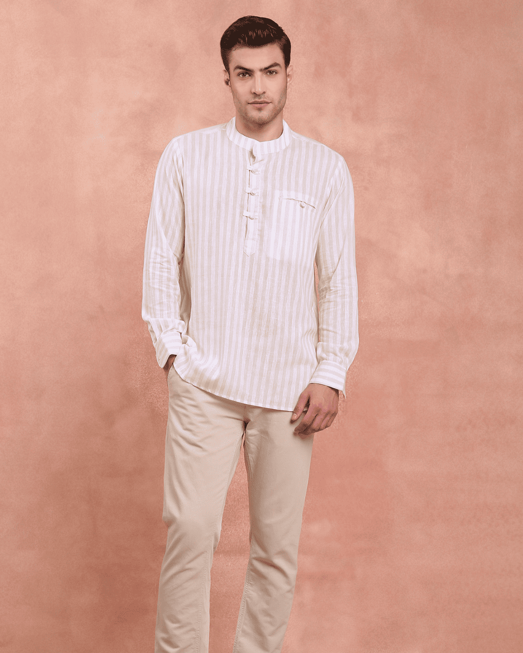 Calm, neutral, and designed to flow with you — This Kurta Shirt blends subtle beige stripes with a laid-back kurta silhouette. Great for day-to-evening fits when you want ease without effort.